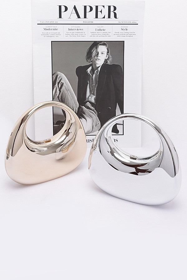 Add a sleek, modern twist to your evening look with this Metallic Plastic Party Clutch. Its unique, glossy finish and sculptural design make it the perfect accessory for special occasions. This clutch offers both style and functionality with its spacious interior and durable mixed-metal and plastic construction. Ideal for carrying your essentials while keeping your outfit effortlessly chic.