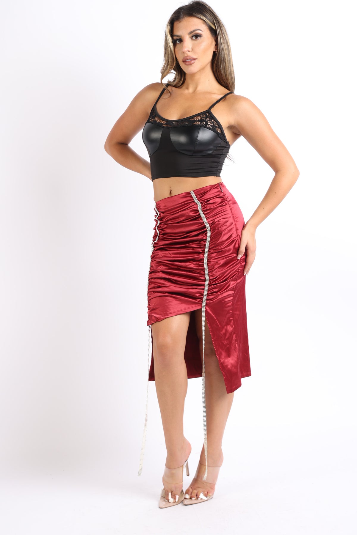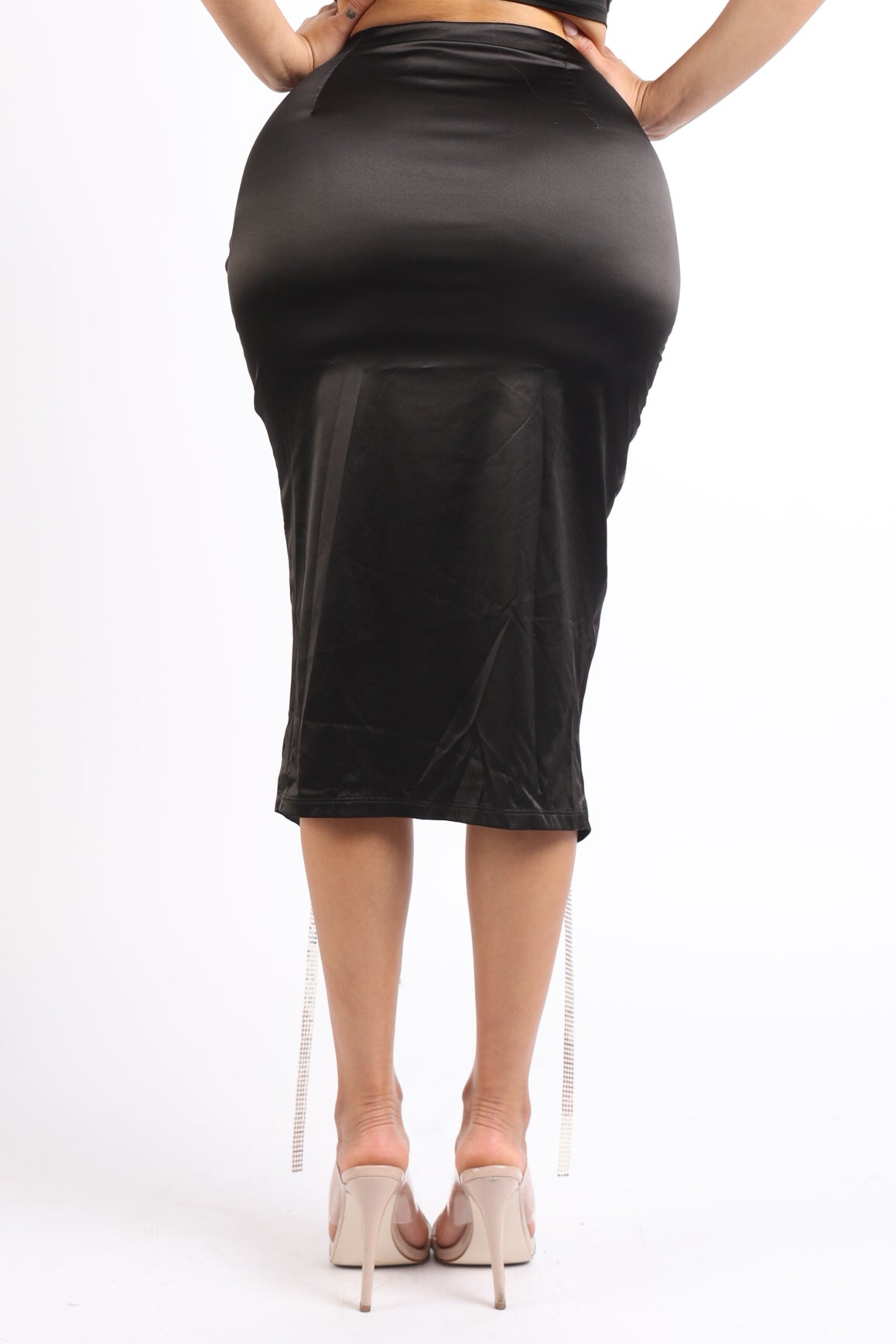 Dazzle in our Rhinestone Drop Satin Skirt. The cascading rhinestones add a touch of glamour to this sleek silhouette. Elevate your style effortlessly with this chic skirt, perfect for making a sparkling statement at any occasion.