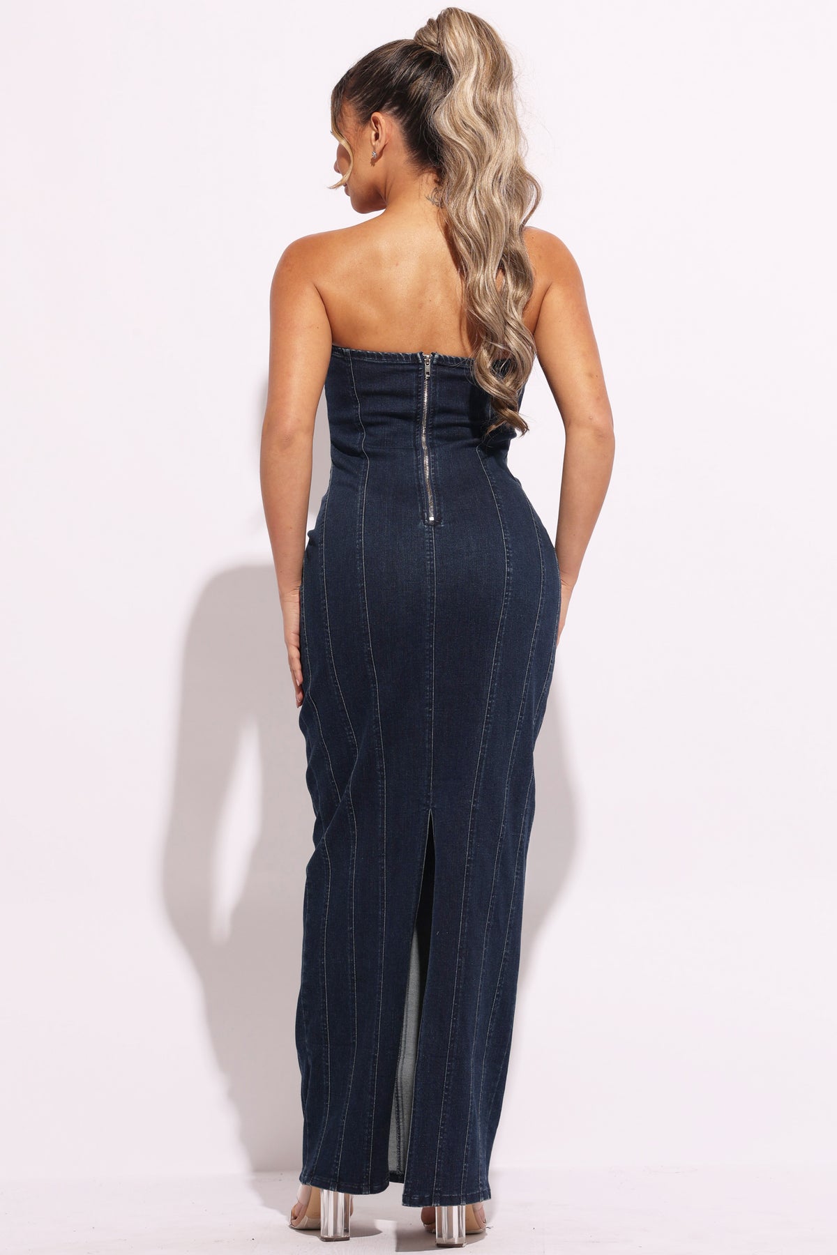 Stitching detailed denim tube maxi dress