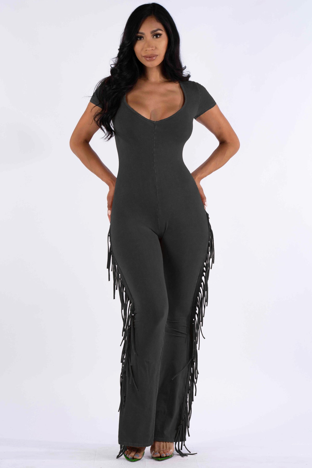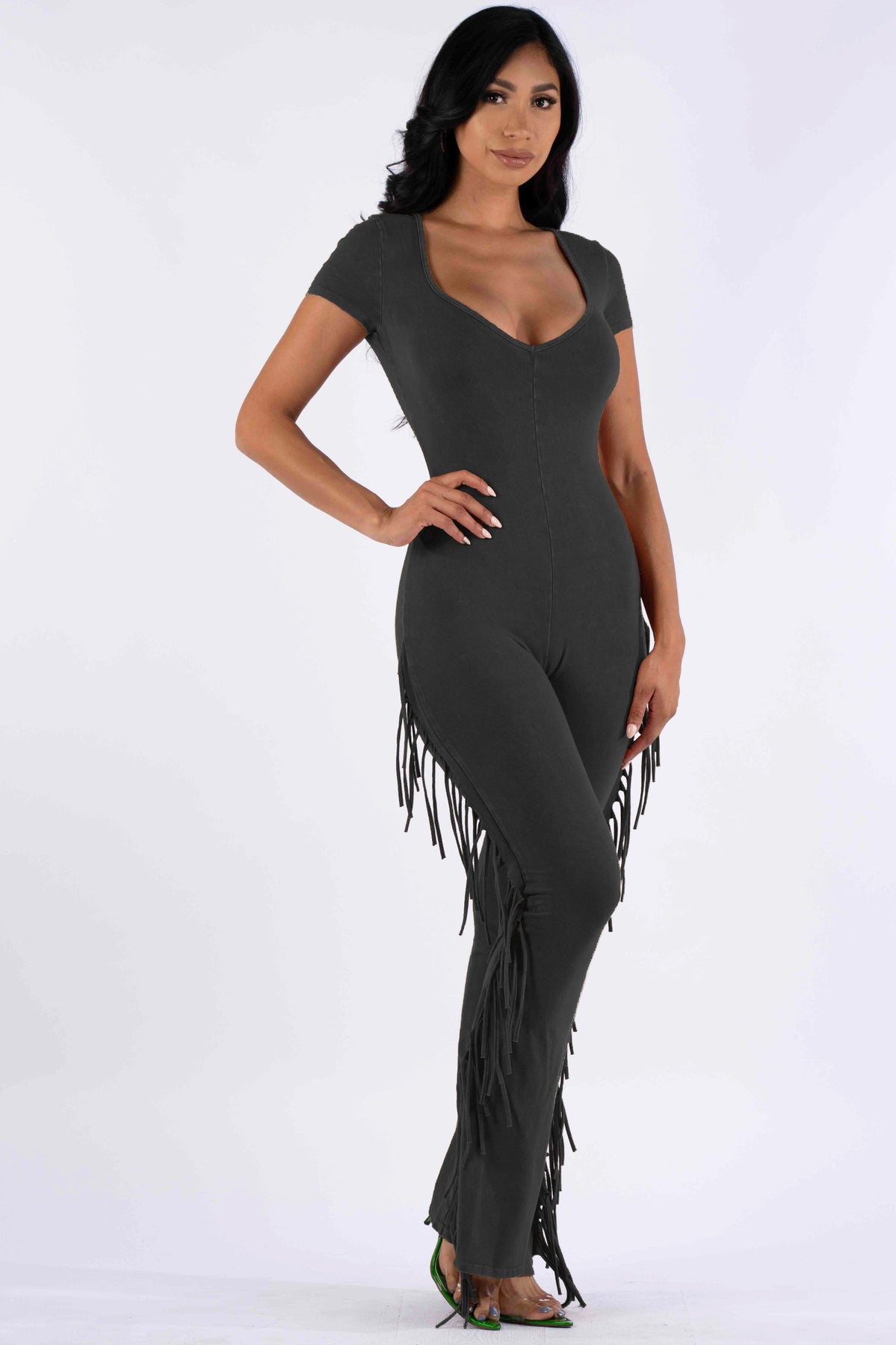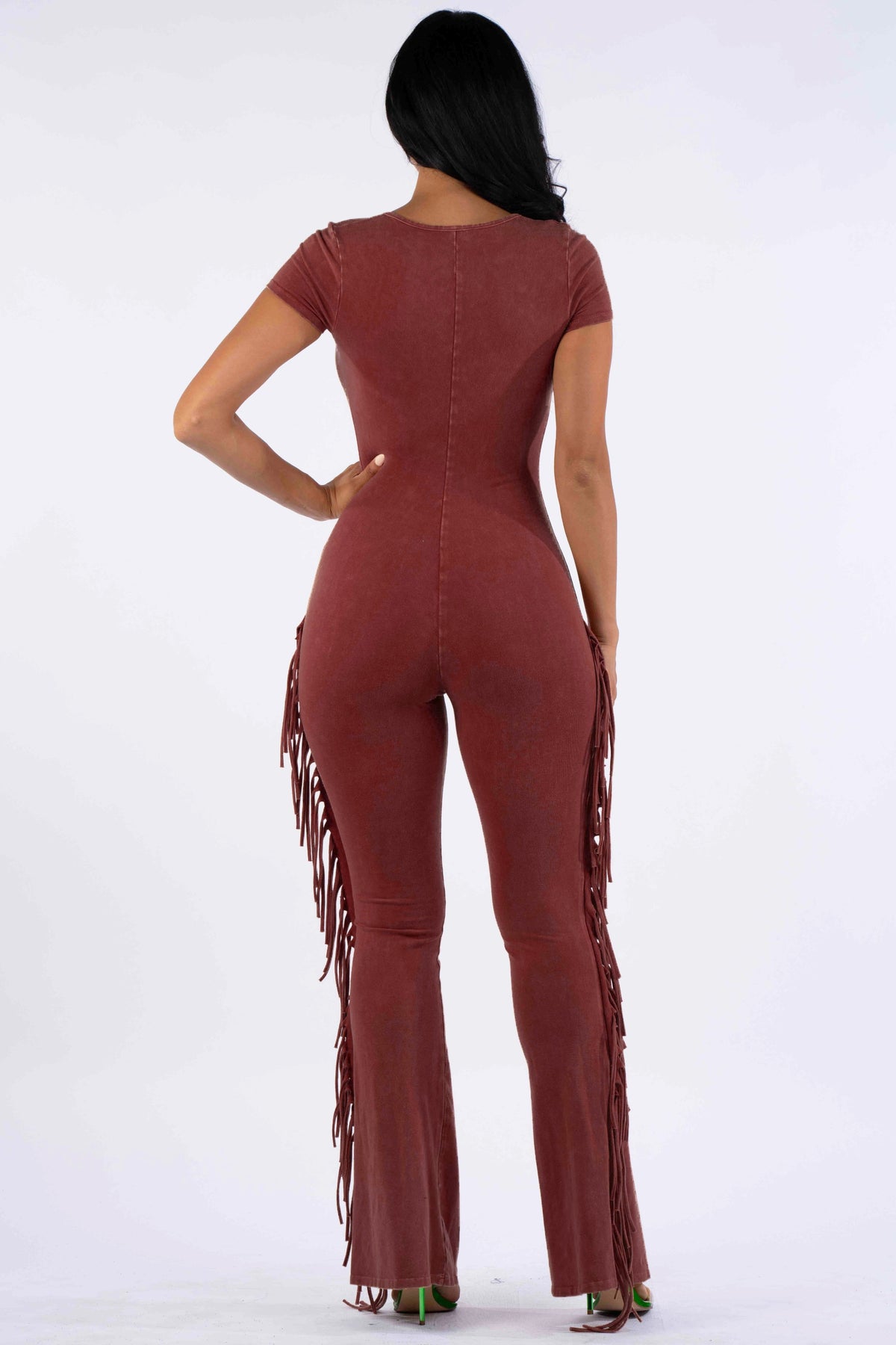 Dive into boho-chic vibes with our Mineral Washed Fringed Jumpsuit. The unique mineral wash adds character, while the playful fringe details bring a free-spirited flair. Perfect for a statement look with comfort. Elevate your style with this on-trend jumpsuit that merges fashion and individuality