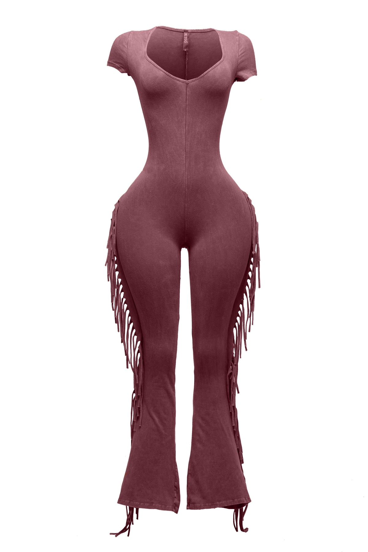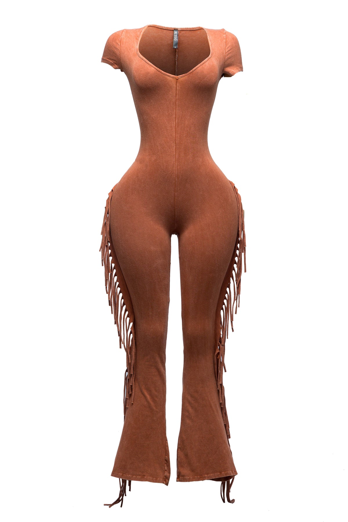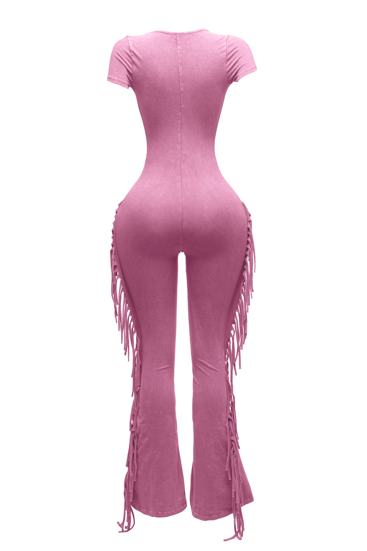 Dive into boho-chic vibes with our Mineral Washed Fringed Jumpsuit. The unique mineral wash adds character, while the playful fringe details bring a free-spirited flair. Perfect for a statement look with comfort. Elevate your style with this on-trend jumpsuit that merges fashion and individuality