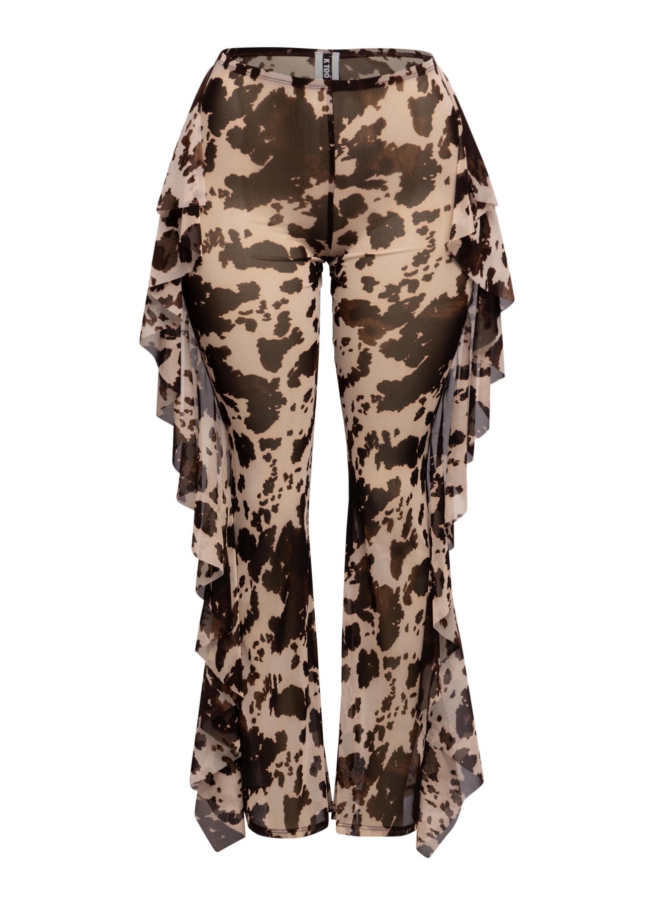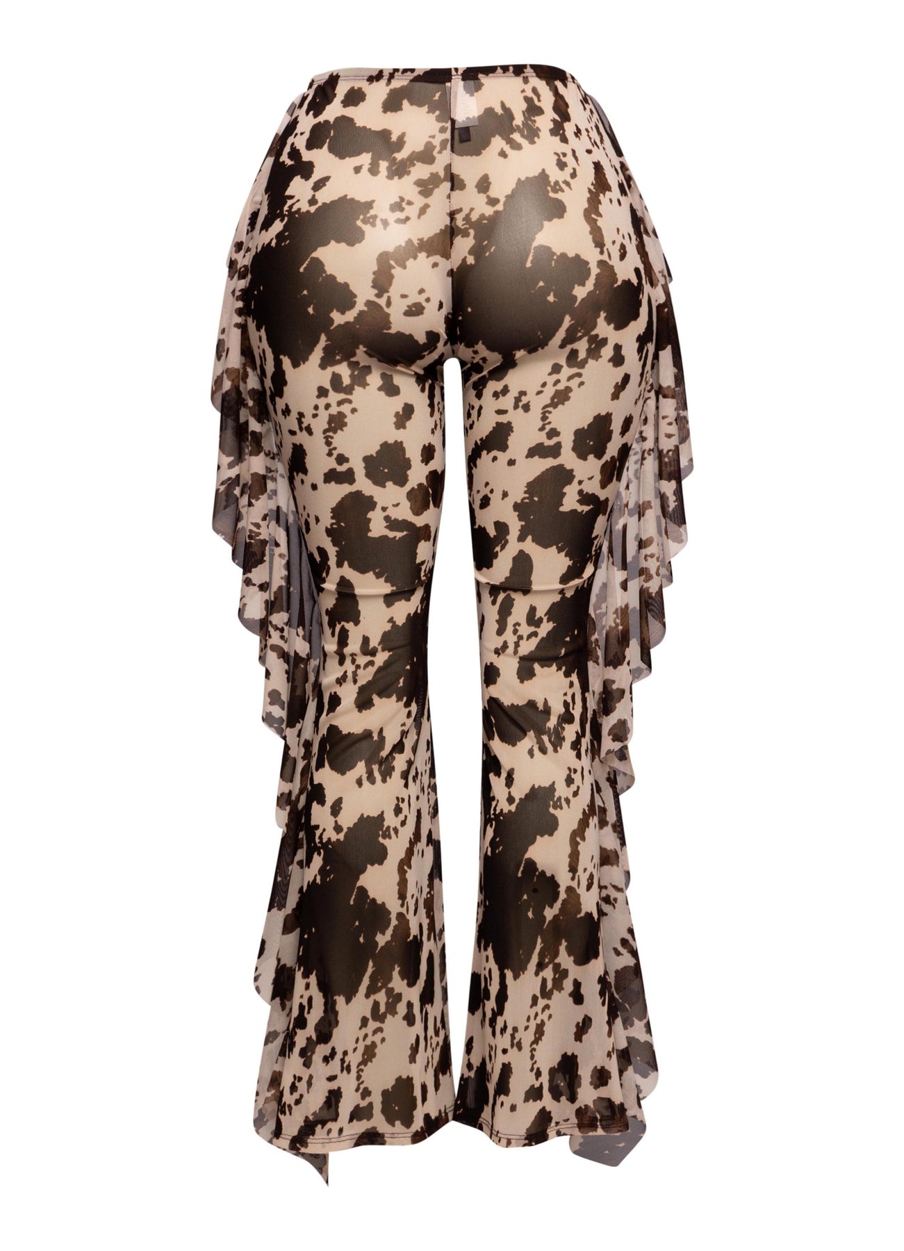Turn every sidewalk into a runway in the On the Prowl Sheer Mesh Ruffle Pants. With a high-waisted fit, fully sheer printed mesh, and flirtatious side ruffle trim, these lightweight statement pants are made for sultry layering. Pair them with your hottest bodysuit or bikini for festival weekends, beach clubs, or an unforgettable night out.