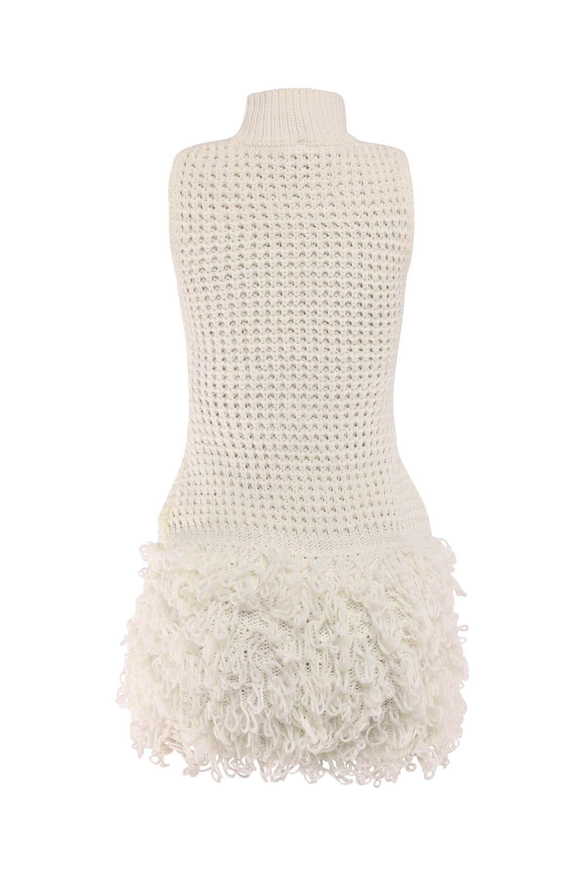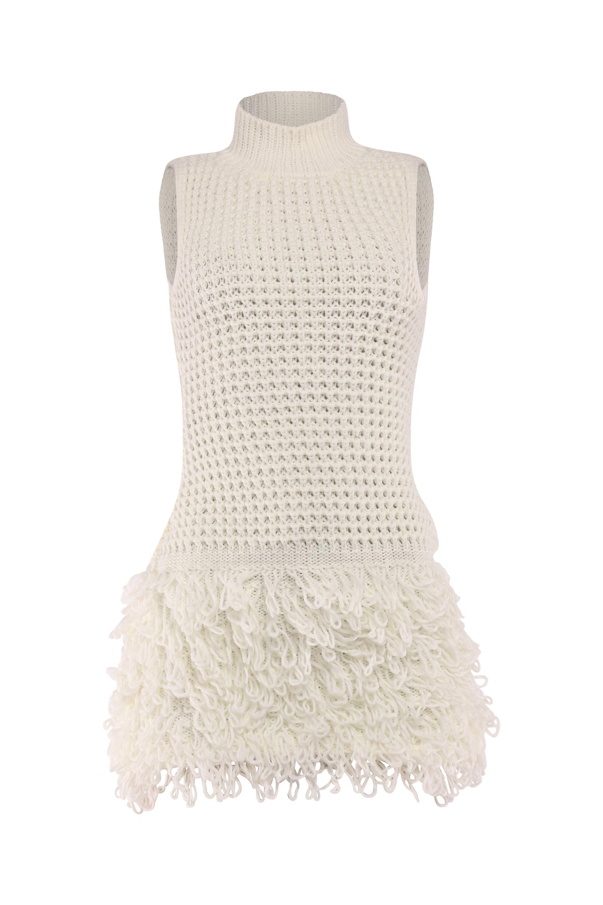 Meet your next going-out obsession: the Fringe Behavior Knit Mini Dress brings the heat with a high-neck silhouette and all-over open knit texture. Crafted in a sheer body-hugging fabric with subtle stretch, this mini is detailed with playful looped fringe at the hemline for a flirty shake-it effect. Its sleeveless cut and pull-on fit make it effortlessly cool—whether styled with heels for nightlife or layered over swim for a glam vacation vibe.
