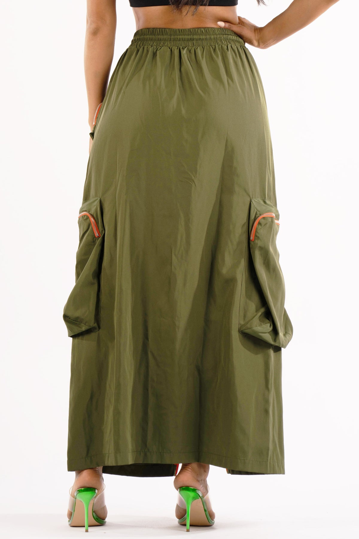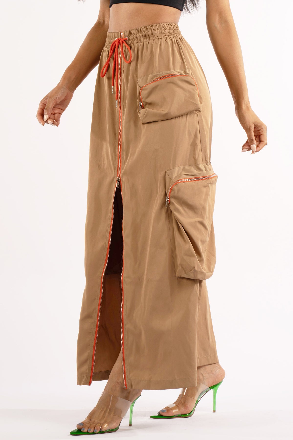 Effortless utility meets style in our Zipper Front Drawstring Waist Cargo Maxi Skirt. The edgy zipper detail and functional drawstring waist combine for a chic, versatile look. Perfect for those who embrace both fashion and functionality. Elevate your wardrobe with this modern maxi skirt