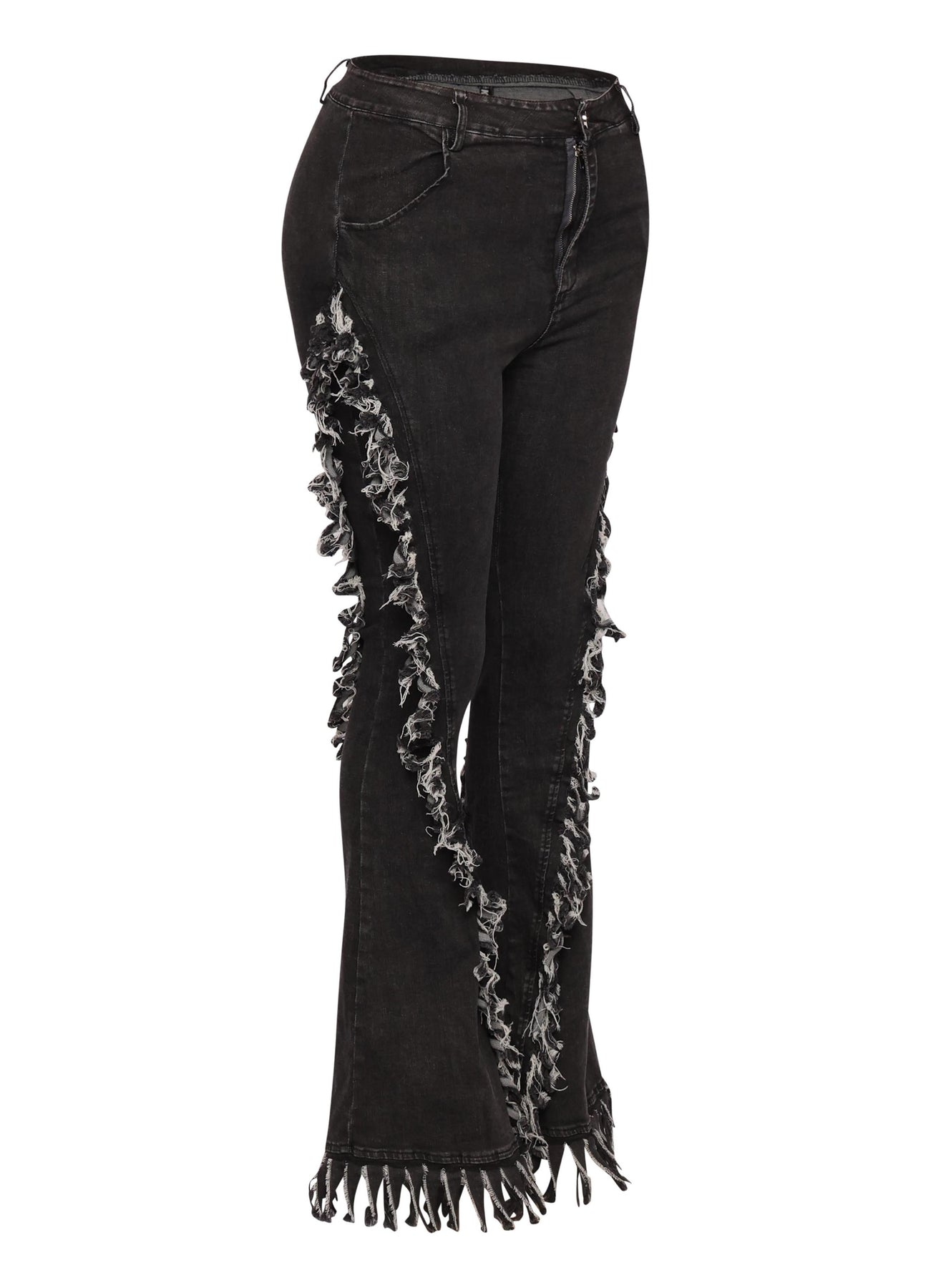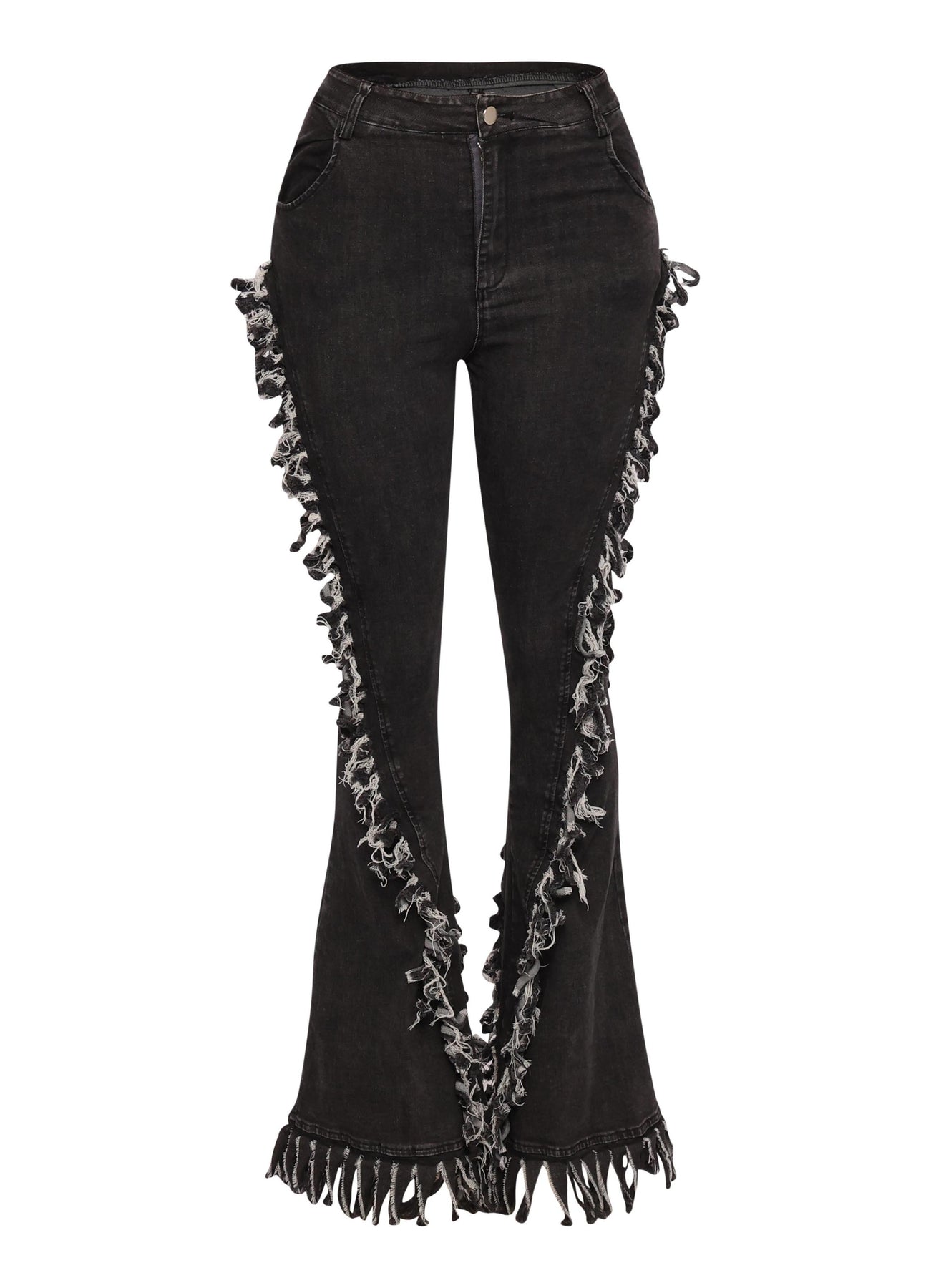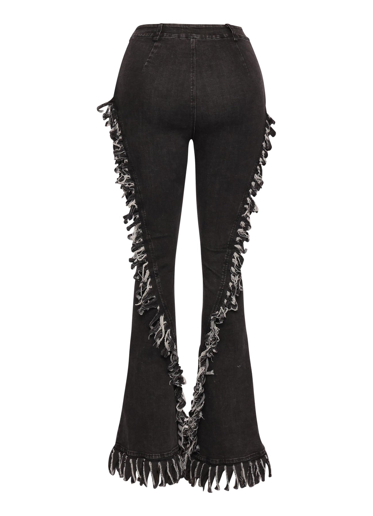 Distressed fringe denim flared pant.