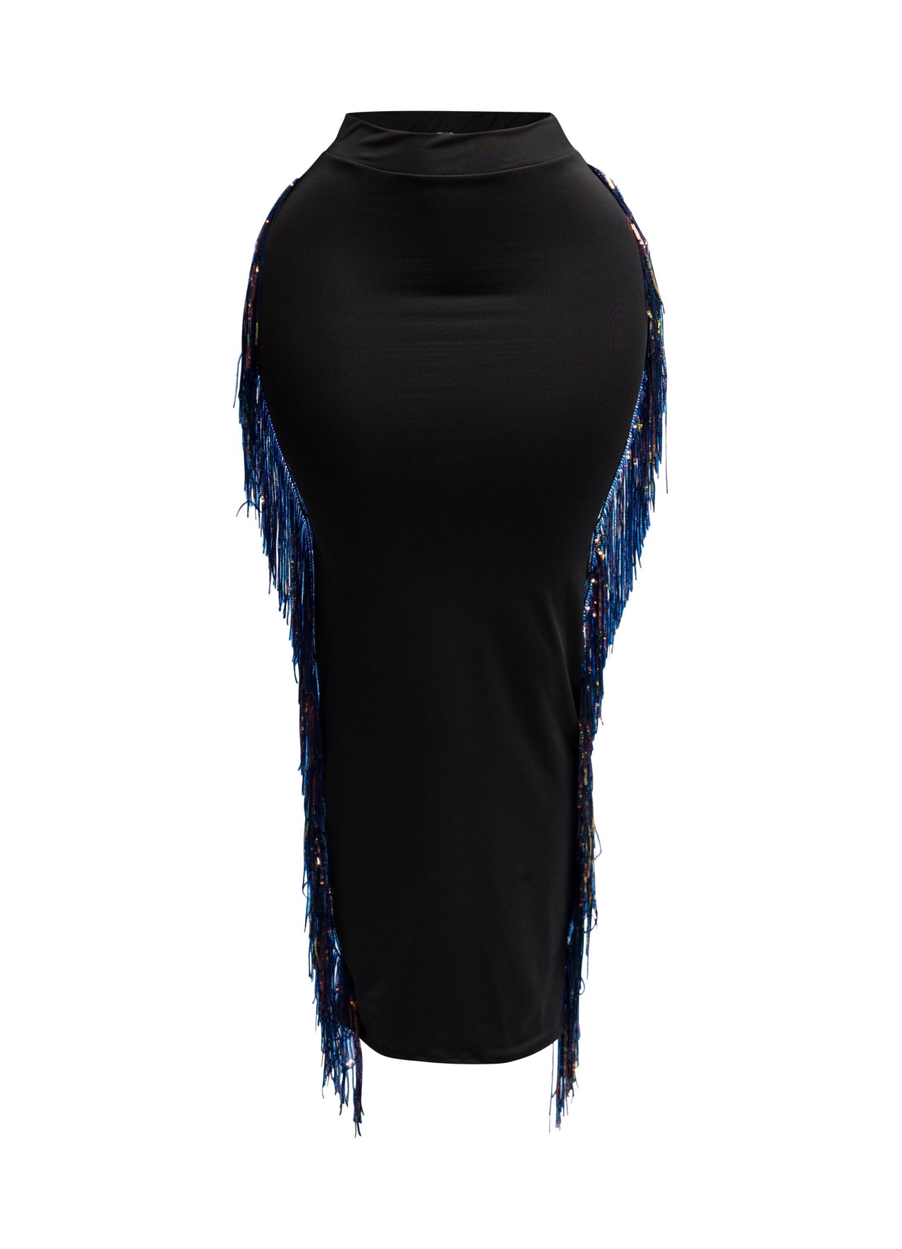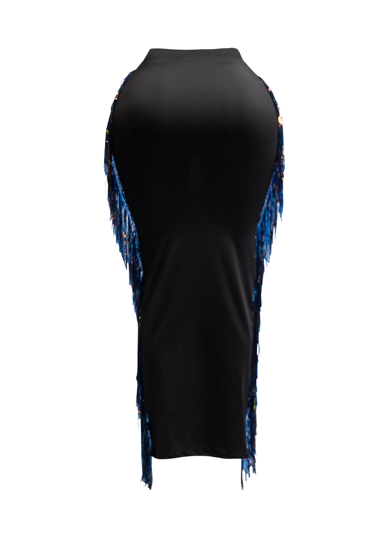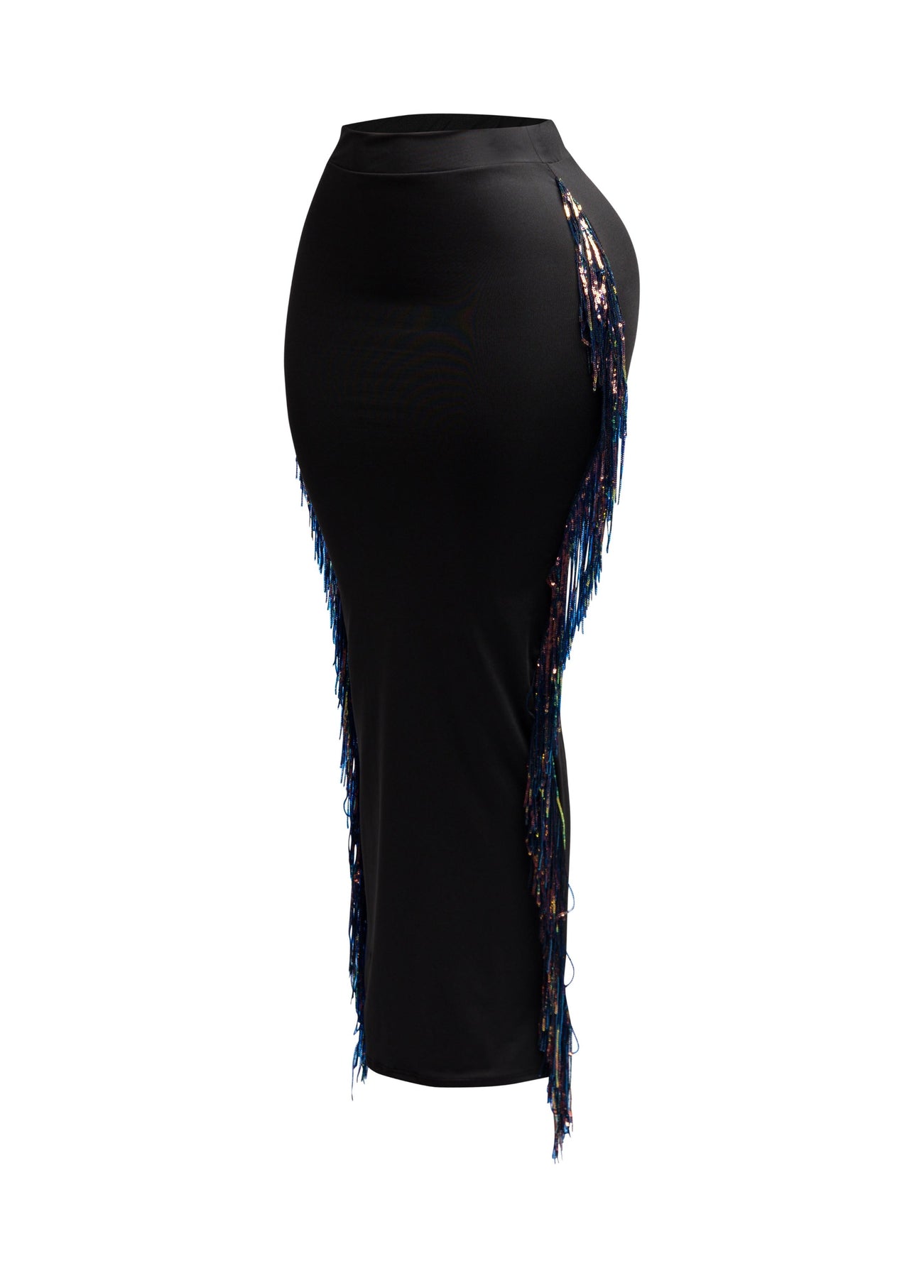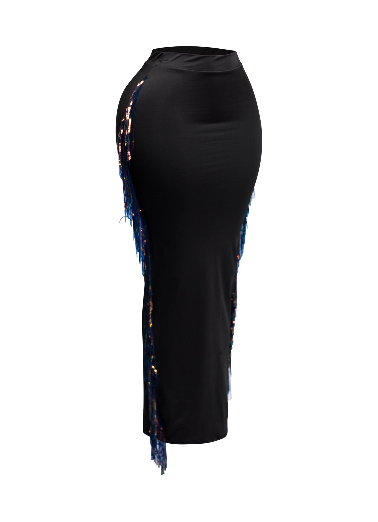 the sequins fringe maxi pencil Skirt is the perfect choice to make a dramatic statement. It features a beautiful sequin fringe, and will look great paired with a cute fitted white tee or layered under your favorite graphic tee. You're sure to get plenty of compliments when you wear this skirt!