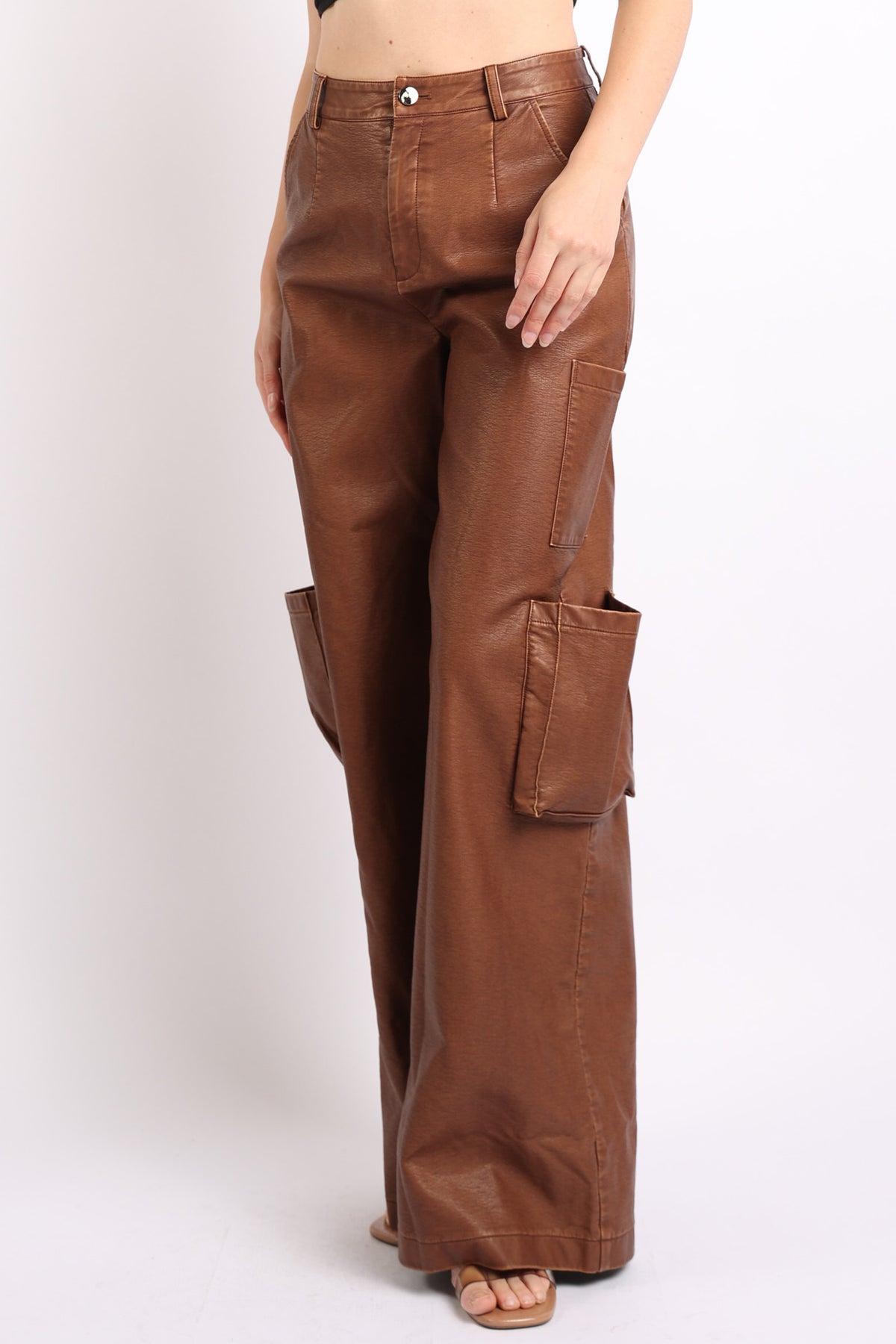 Experience urban edge in our Washed Faux Leather Cargo Pocket Pants. Featuring button and zipper closure, front and back pockets, and a cargo pocket, these pants blend style and functionality seamlessly. Embrace contemporary street fashion with a rebellious flair.