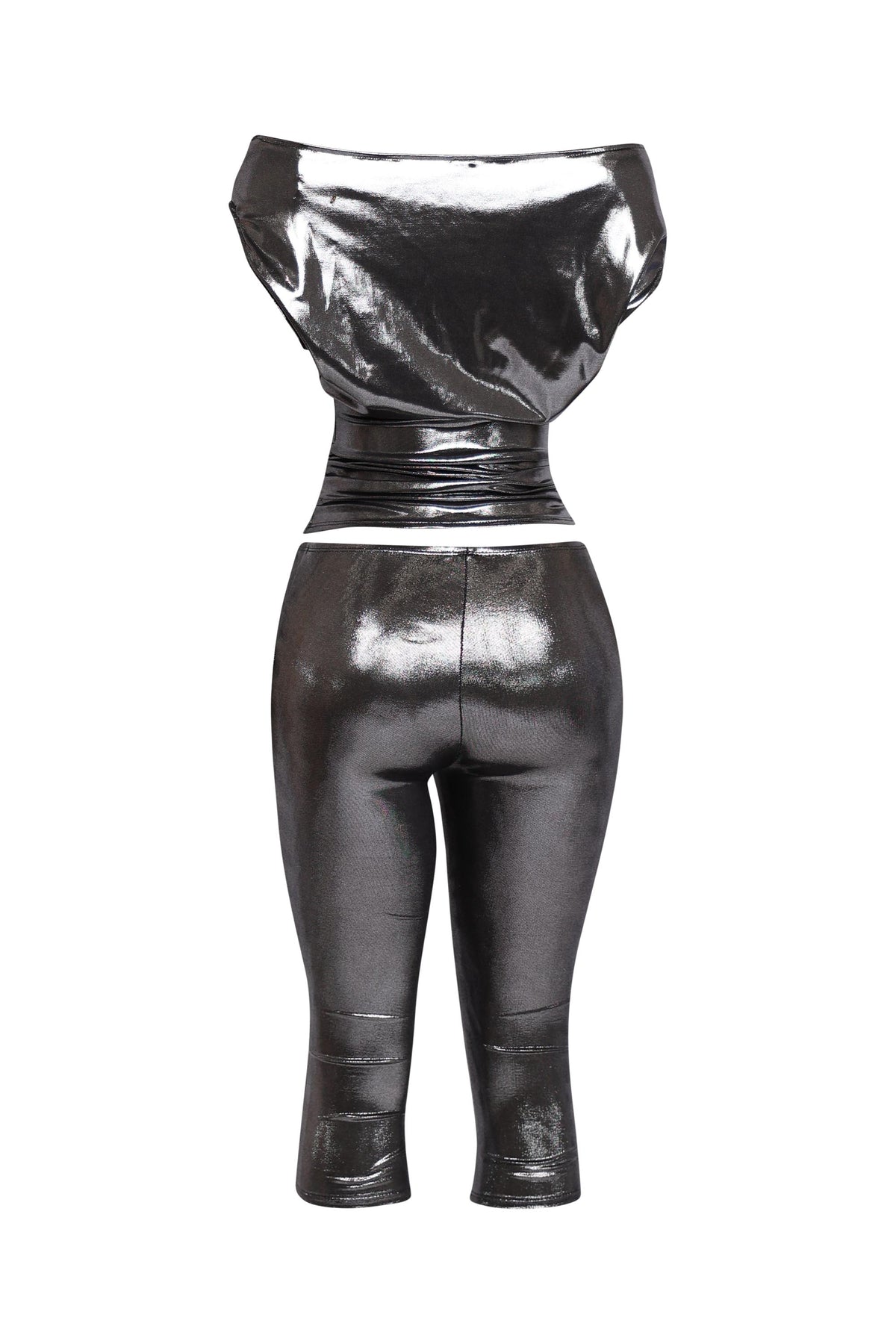 Glow mode: activated. This asymmetrical shimmer set brings full-body impact with a slouchy, off-shoulder top and curve-hugging capri bottoms. The luxe metallic finish catches every beam of light while the fit-to-flare contrast creates that coveted hourglass vibe. Slip it on, style it up, and let the shine do the flirting.