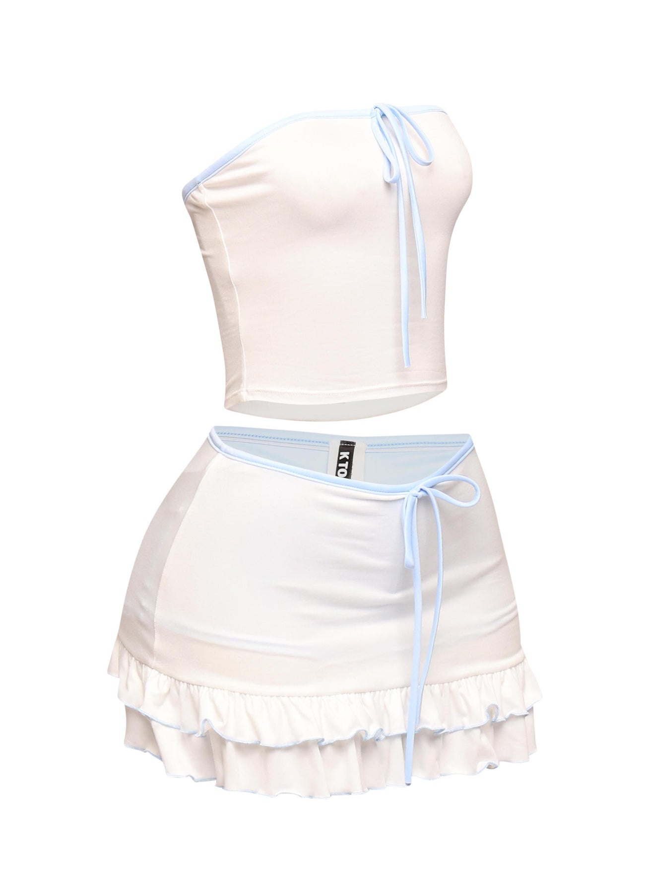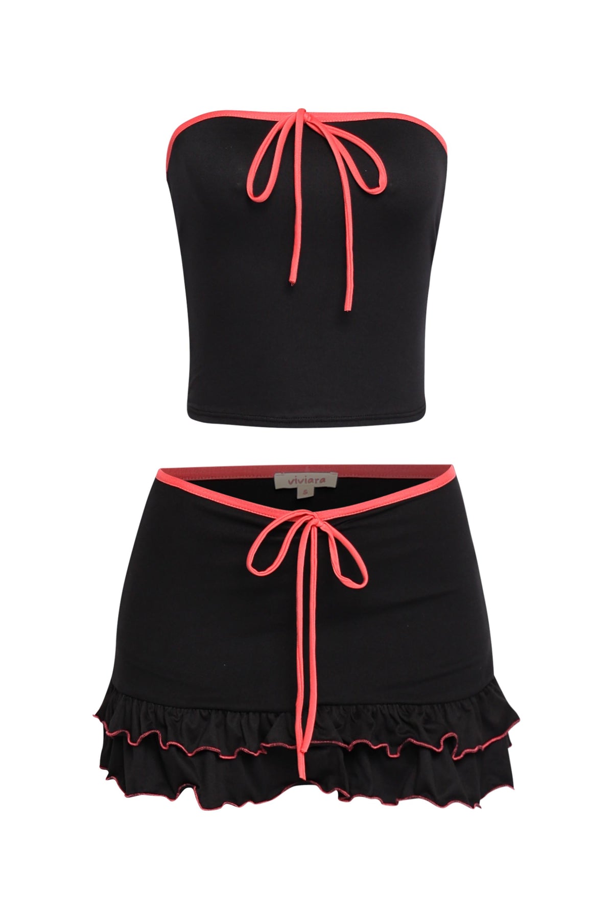 Sweet but make it spicy. This two-piece set brings all the heat with a flirty tube top and ruffle mini skirt, trimmed in juicy contrast piping that turns heads. Whether you’re rocking the bold black and hot pink combo or keeping it dreamy in white with soft blue trim, this set delivers comfy stretch, major flirt energy, and endless outfit potential. Slip it on and serve up cute girl confidence from brunch to beach club.