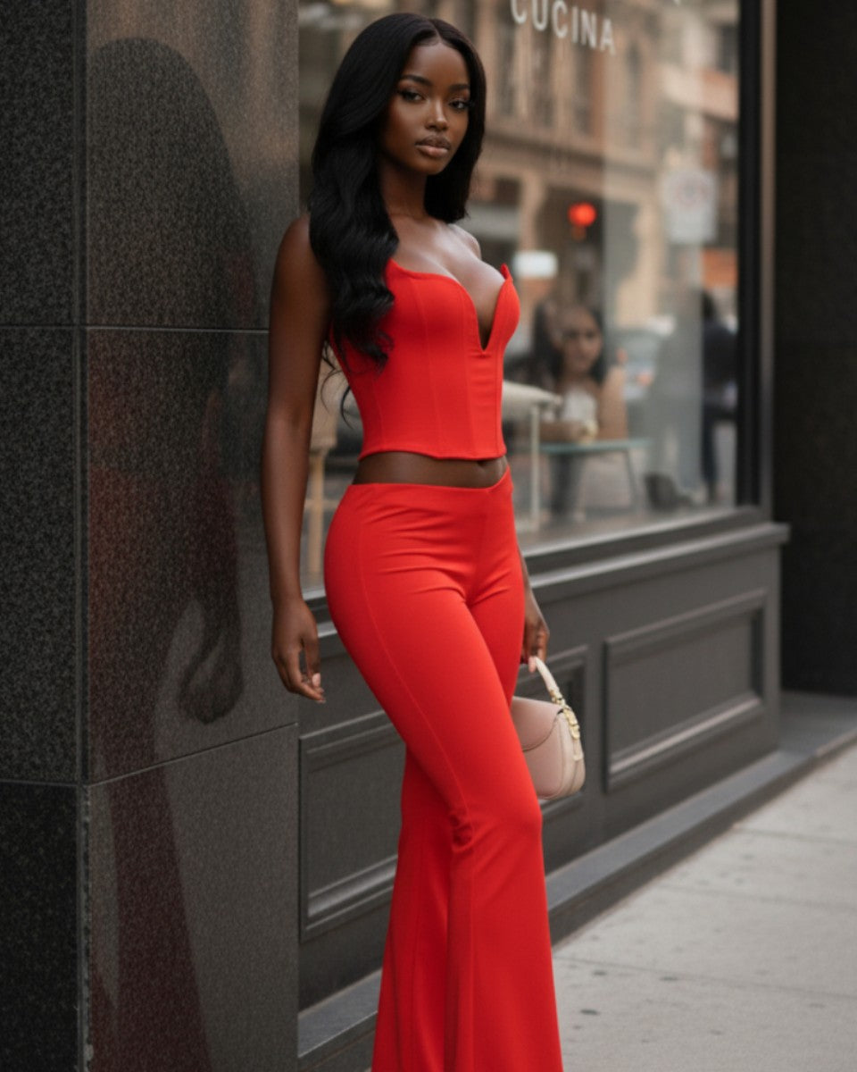 Serve shape and statement in the Heartbreaker Hourglass Corset Flare Set—a fire fit designed to hug curves and steal attention. The structured, strapless corset top features a wired V-dip neckline and zip-up back for that cinched effect, while the matching high-waisted flared pants balance it out with a leg-lengthening 35" inseam and body-skimming fit. With built-in stretch and a sleek finish, this set blends comfort with major main character energy. Available in classic black or bold red—your choice, but both say "I'm the one." Hot on Pinterest? Absolutely—flared pants, corset tops, and matching sets are dominating right now.