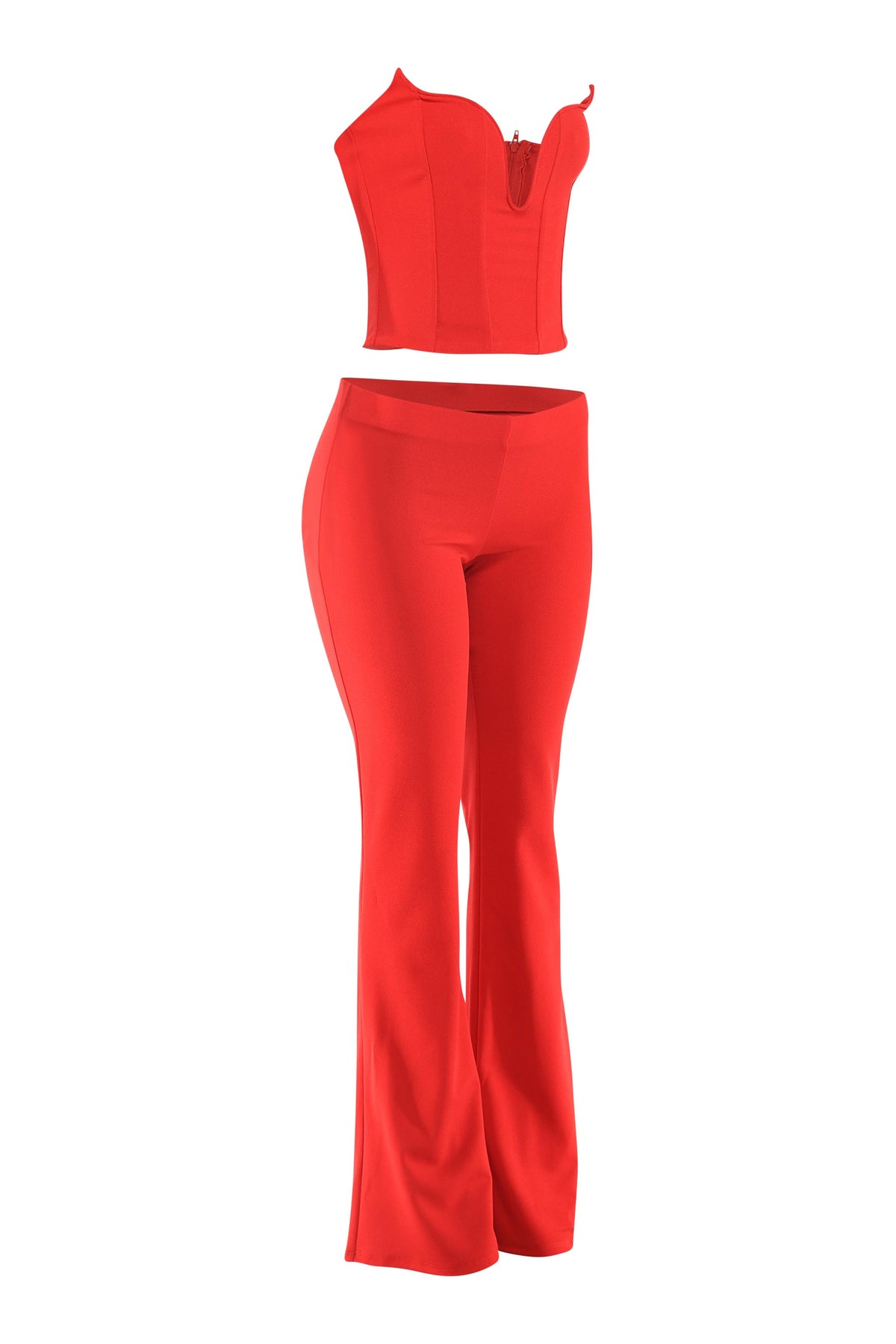 Red wired corset top and matching flared pants front view with bold fitted silhouette