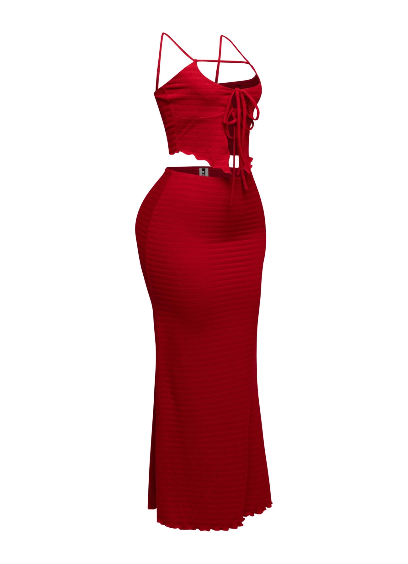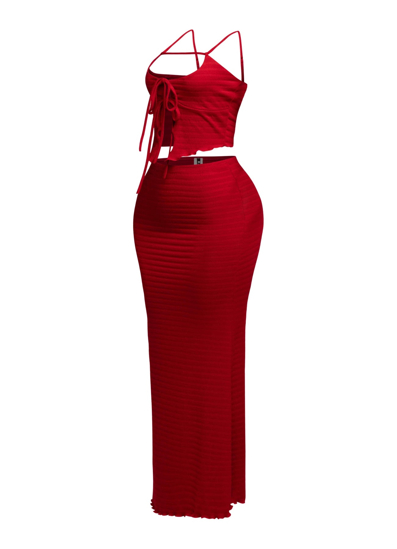 When you want all eyes on you—Crave Control is it. This spicy two-piece set pairs a ruched smocked crop top with sexy front tie detailing and a matching curve-hugging maxi skirt. The textured stretch fabric molds to your shape while the peekaboo neckline and merrow-edge hem keep the vibe soft and sultry. Whether styled up for dinner or down for a day date, this look brings serious energy.