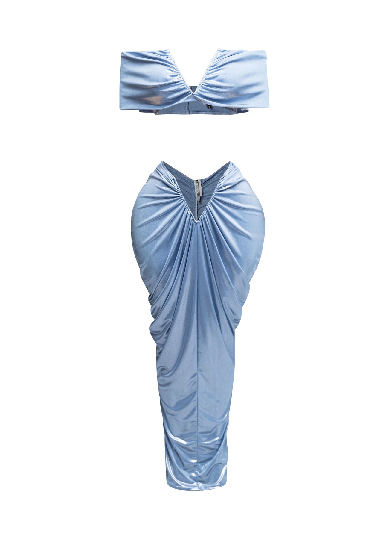 Get ready to turn heads with these gorgeous two-piece skirt sets, designed to accentuate your curves in all the right ways. The set includes a cropped top with a flattering V-neckline and a high-waisted, ruched skirt that hugs the body for a perfect fit. Available in striking metallic colors like bronze, silver, and ice blue, this outfit exudes confidence and glamour.