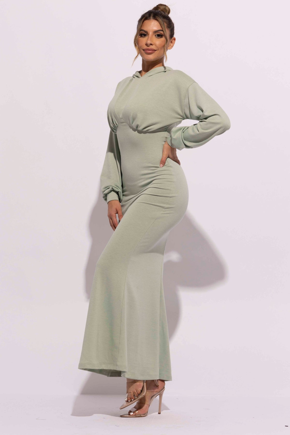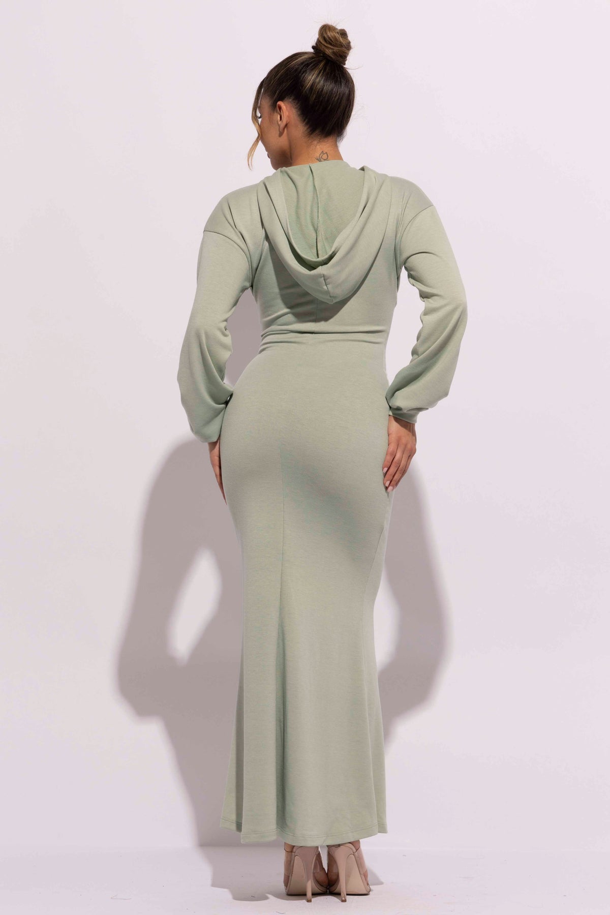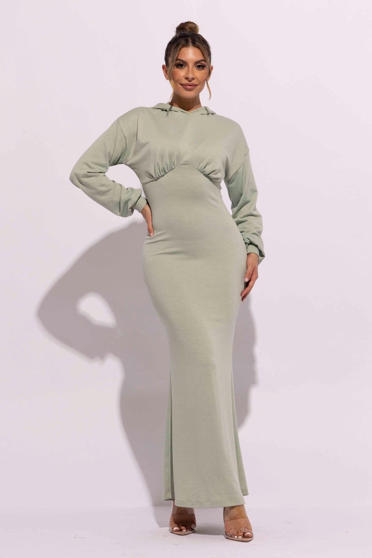 Chic comfort defines our Hoodie Maxi Dress. With a bodycon silhouette, relaxed sleeves featuring wristbands, and a hoodie, this dress effortlessly merges style and ease. Ideal for a fashionable and relaxed look on any occasion.