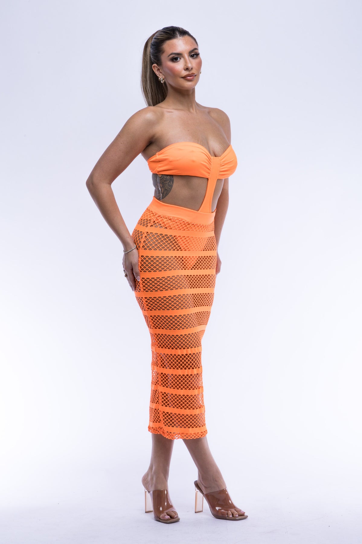Elevate your style with our electrifying Strapless Bodysuit and Mesh Skirt Set. This daring duo pairs a figure-hugging strapless bodysuit with a flirtatious mesh skirt that teases the perfect blend of allure and sophistication.