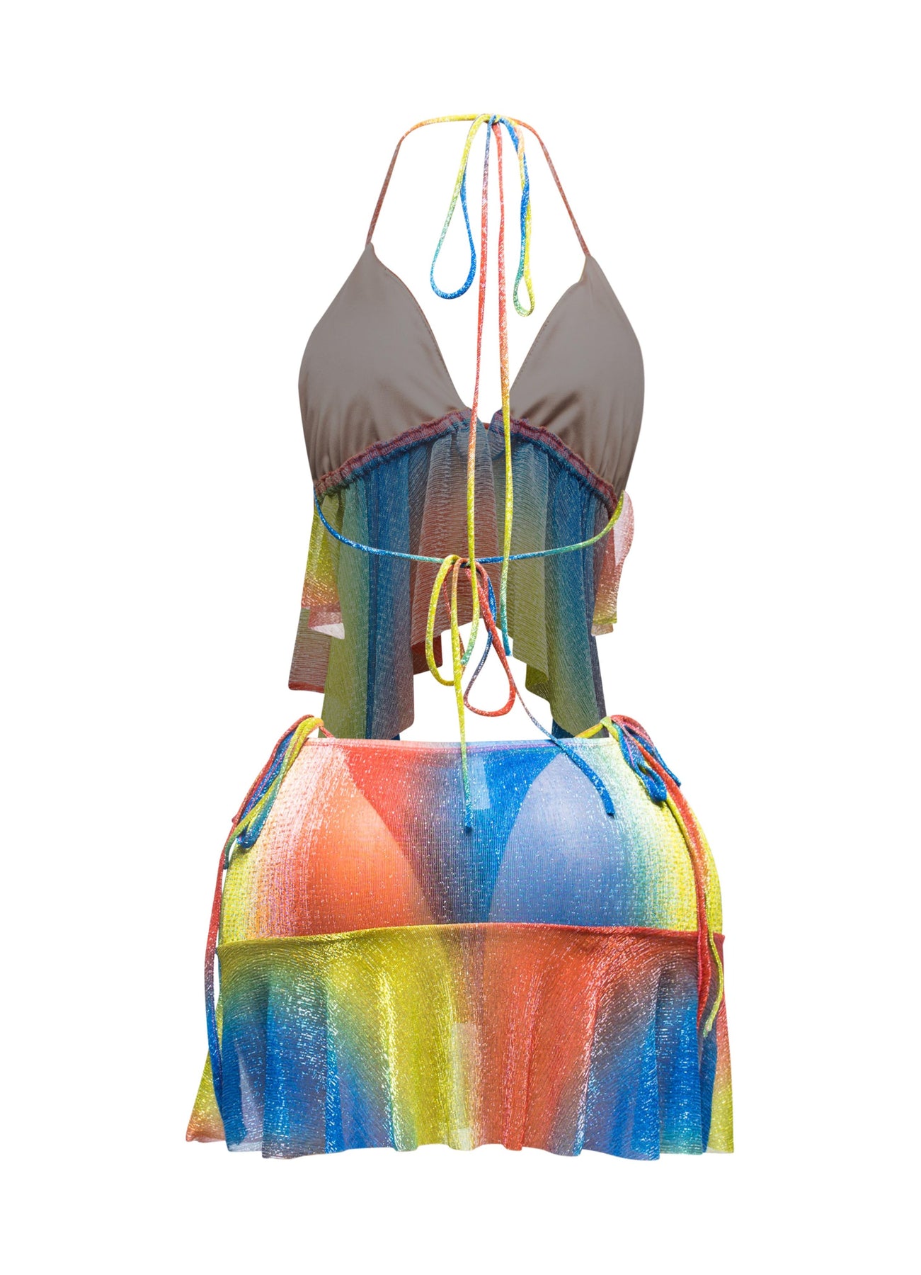- Three-piece sunsuit set featuring a ruffled halter top, bikini bottom, and skirt