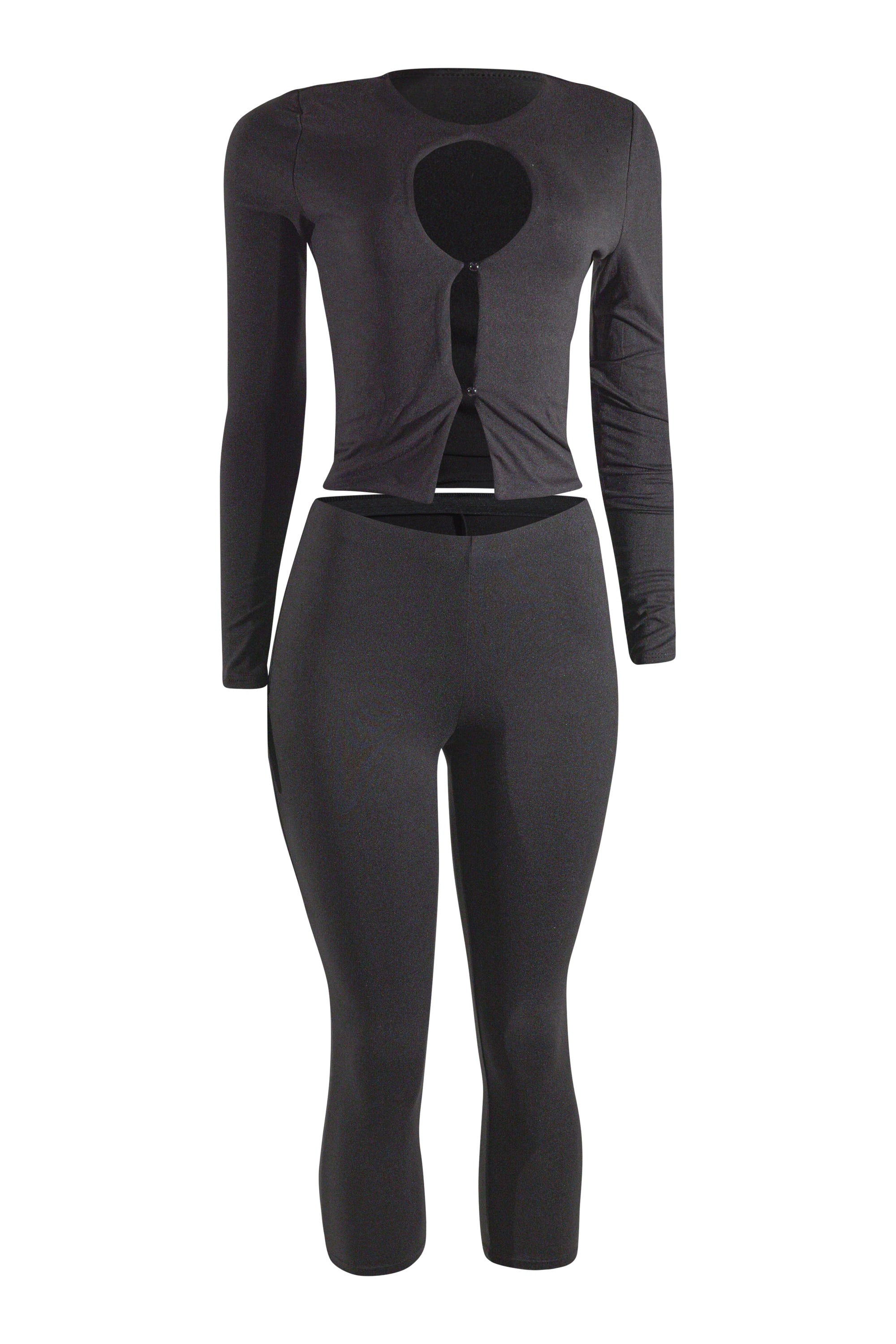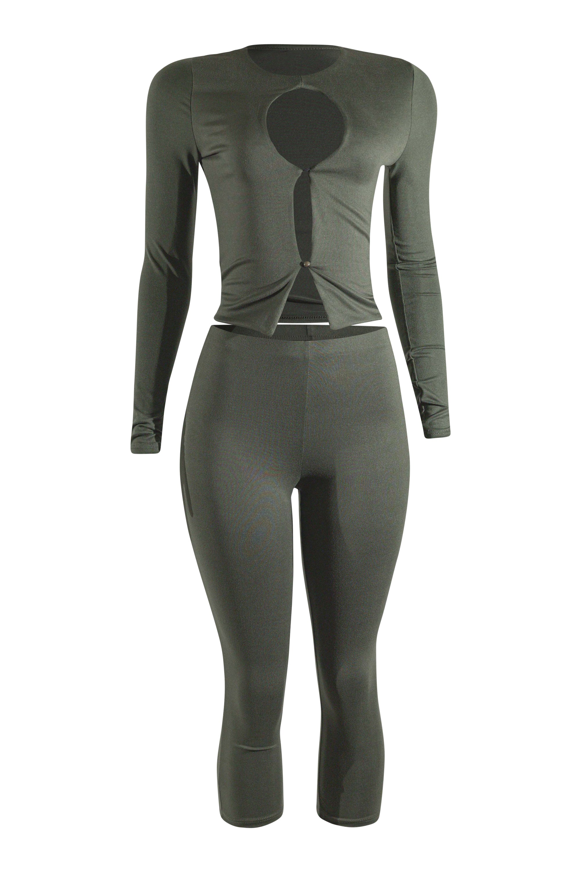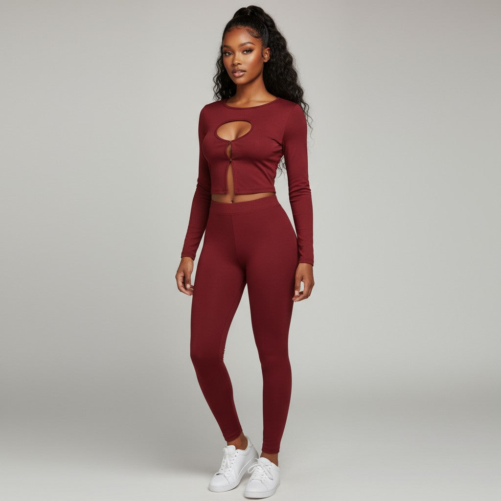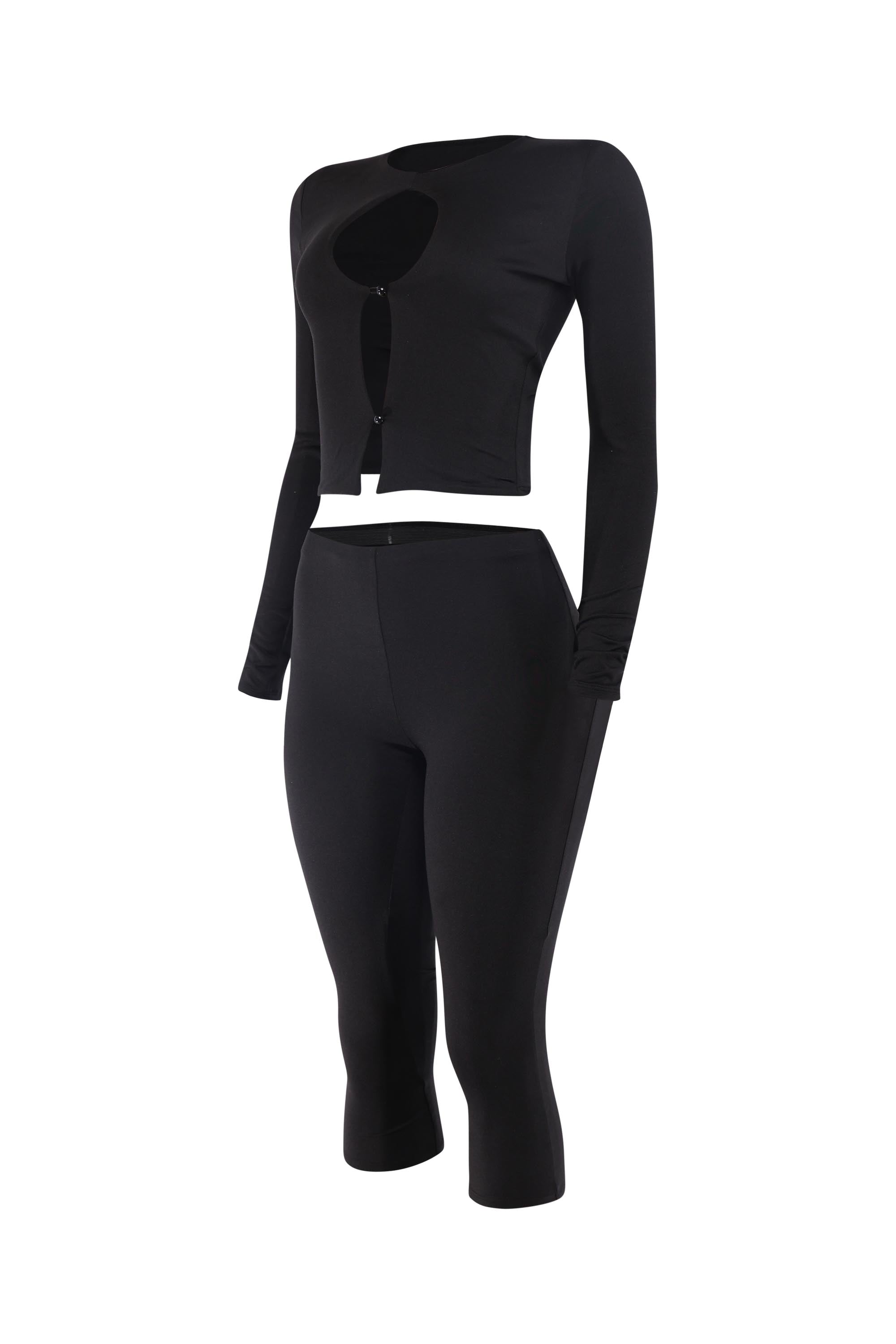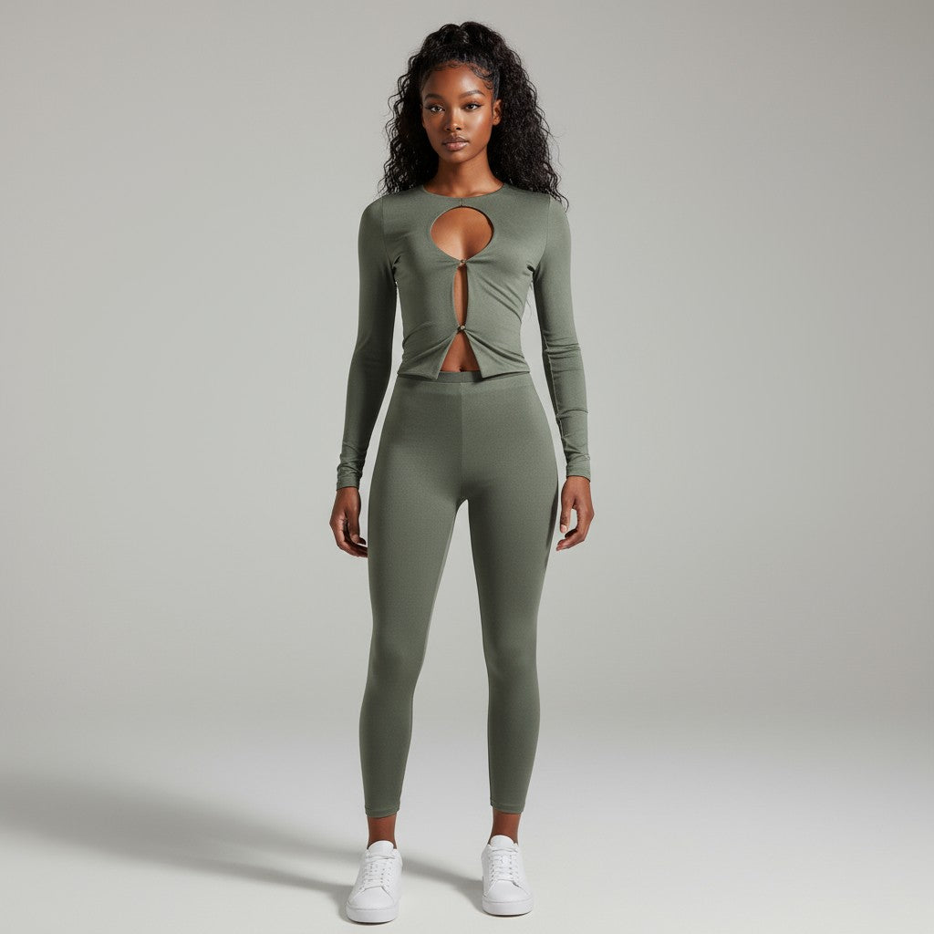 Step out with confidence in the Cut In Line Keyhole Crop Set—a bold, body-hugging two-piece that’s anything but basic. The long sleeve crop top features stacked keyhole cutouts and a front button closure for a peek-a-boo effect that’s daring yet polished. Paired with matching high-waisted capri leggings, this set sculpts your shape with soft stretch fabric and a sleek silhouette. Whether you're hitting a lounge, styling for a casual slay, or layering it under a coat for a fit check moment, this look is made to turn heads.