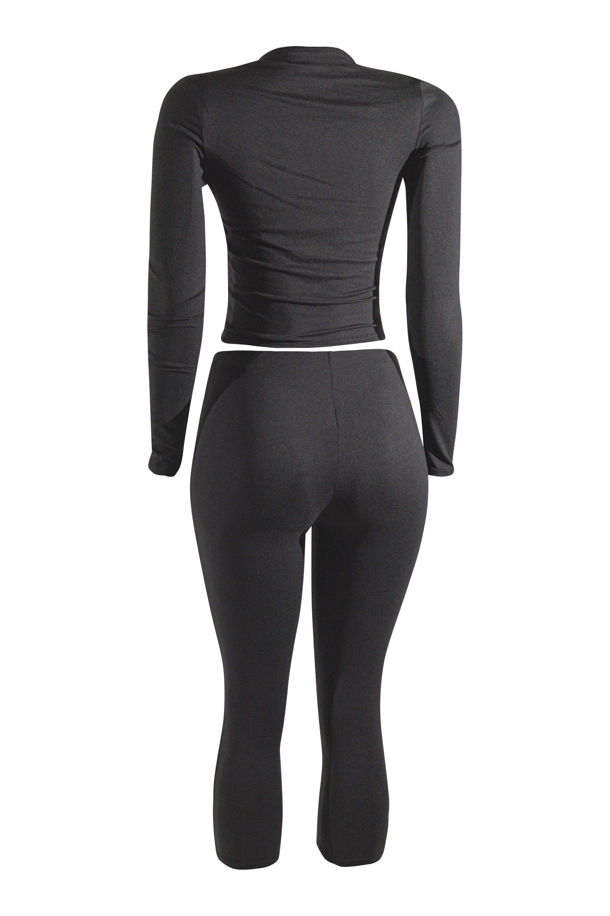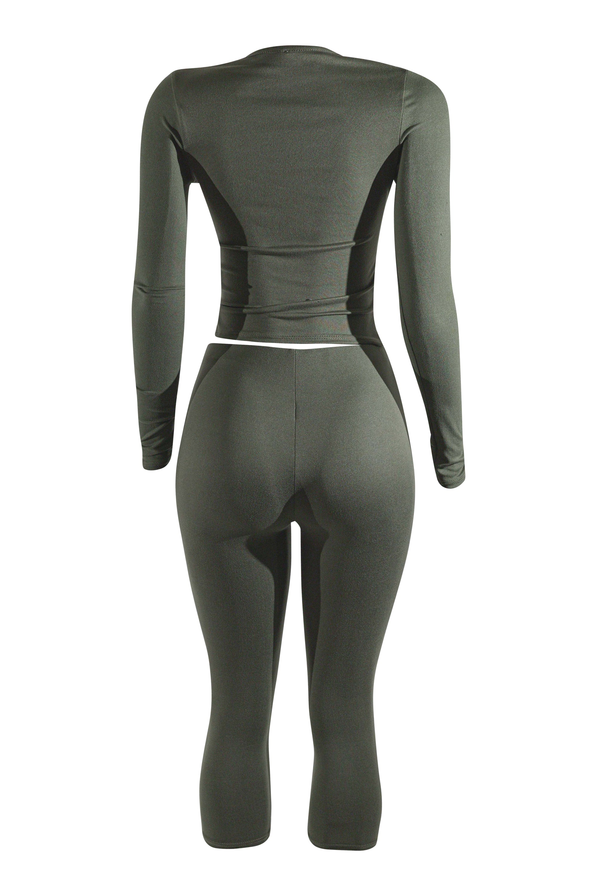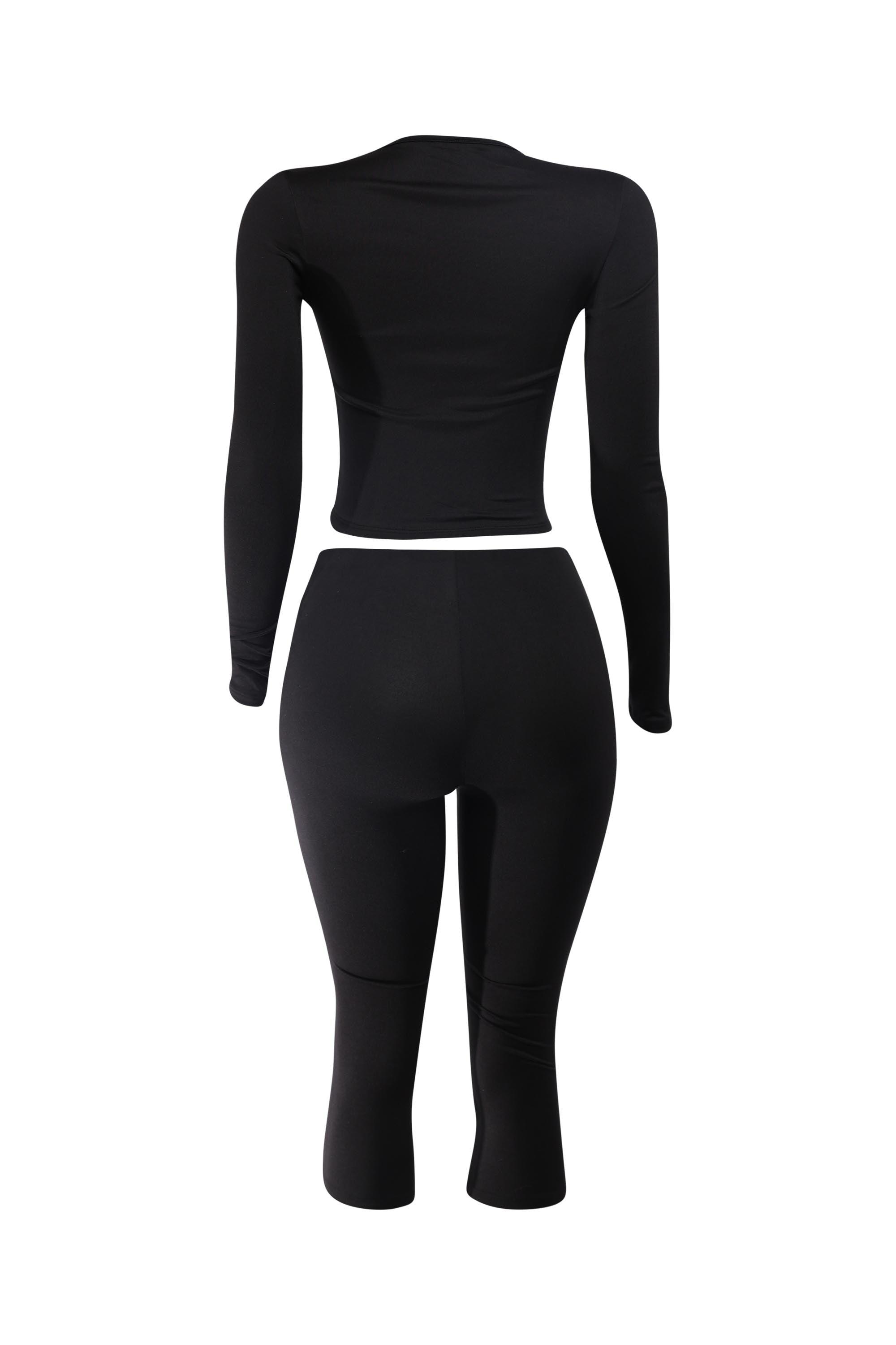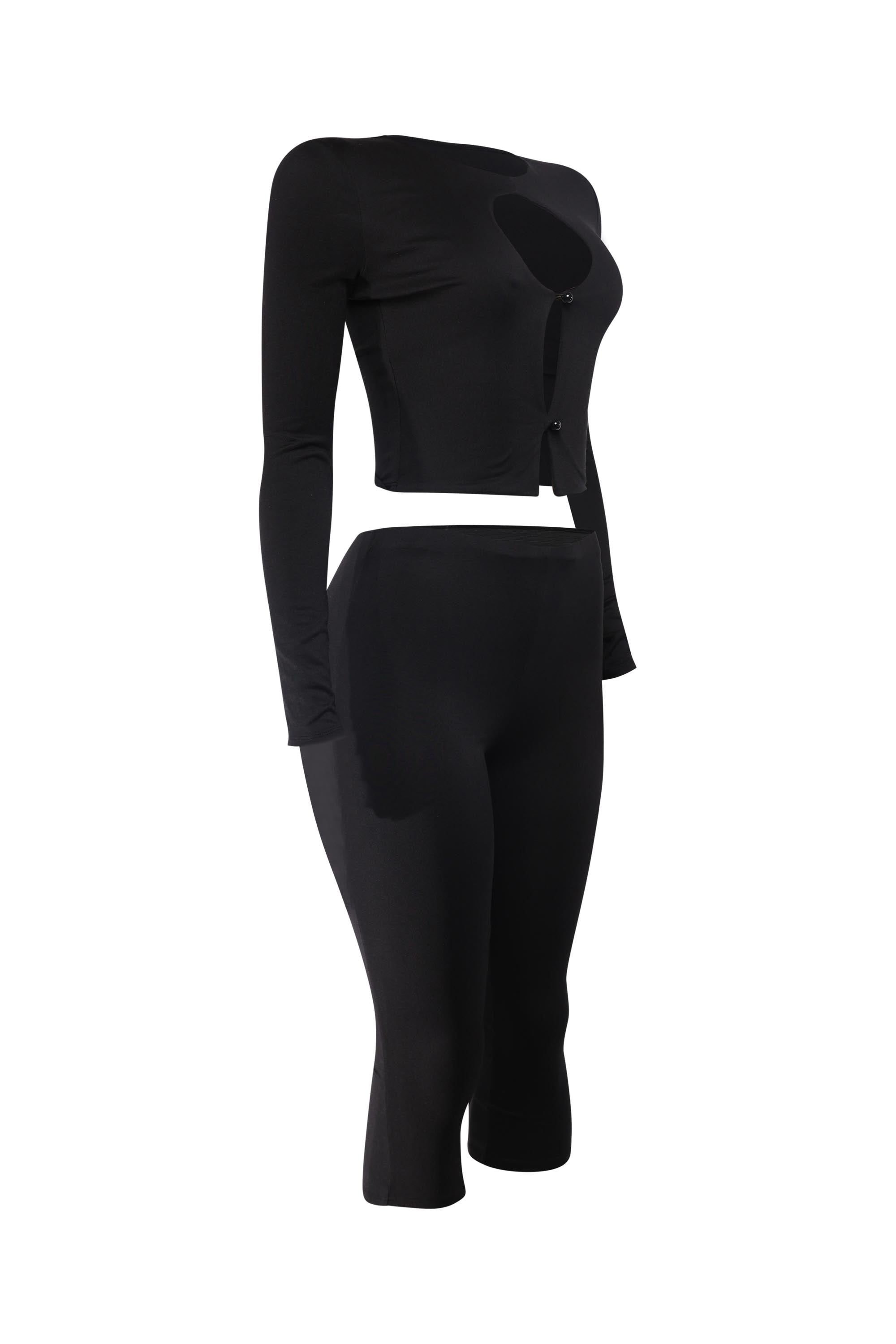 Step out with confidence in the Cut In Line Keyhole Crop Set—a bold, body-hugging two-piece that’s anything but basic. The long sleeve crop top features stacked keyhole cutouts and a front button closure for a peek-a-boo effect that’s daring yet polished. Paired with matching high-waisted capri leggings, this set sculpts your shape with soft stretch fabric and a sleek silhouette. Whether you're hitting a lounge, styling for a casual slay, or layering it under a coat for a fit check moment, this look is made to turn heads.