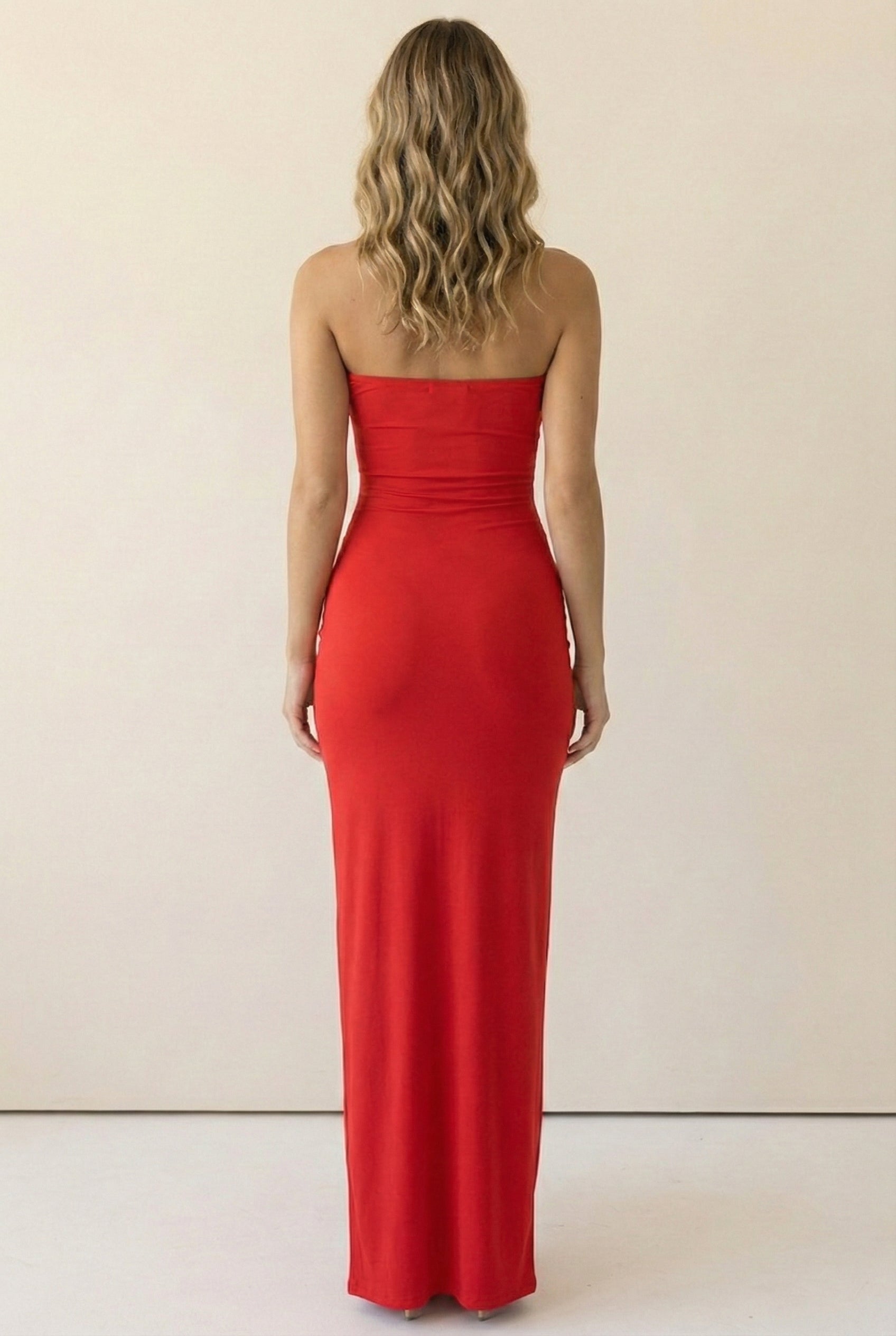 • Strapless slim fit red maxi dress