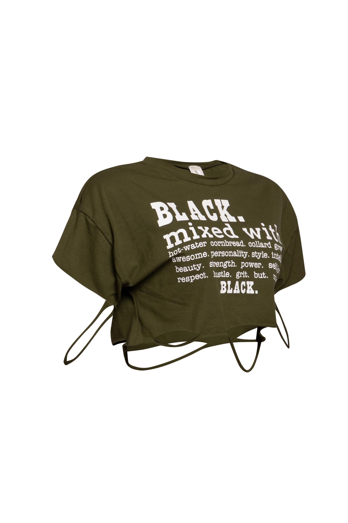 Elevate your wardrobe with the Bogomore Empowerment Crop Top. This stylish cropped top features bold black text on a vibrant green background, celebrating positive attributes like love, strength, power, and beauty. The unique decorative straps at the bottom add an edgy touch, making it perfect for those who love to stand out. Crafted from high-quality fabric, this top is available in three versatile colors to match any mood or occasion.