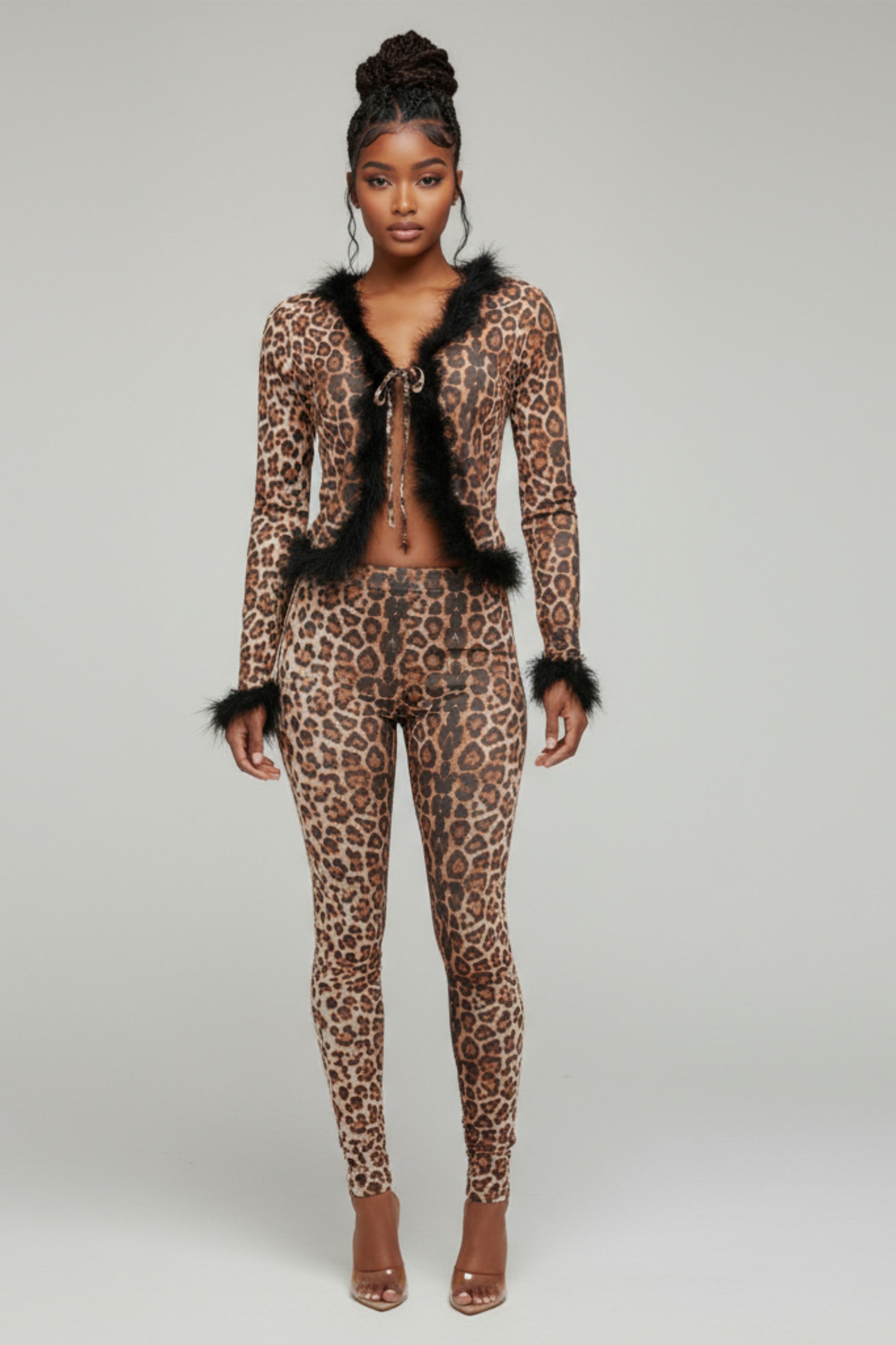 Ready to serve wild glam at home or wherever the vibe takes you? The Prowl Mode Feather Trim Lounge Set is your flirty lounge look leveled all the way up. Featuring a sheer leopard mesh two-piece fit with a fuzzy feather-trimmed neckline, cuffs, and hem—this set brings all the Y2K fantasy energy. The V-neck tie-front top adds drama, while the stretchy pull-on leggings give body without compromising comfort. Perfect for pajama parties, content days, or just being that girl in your living room.