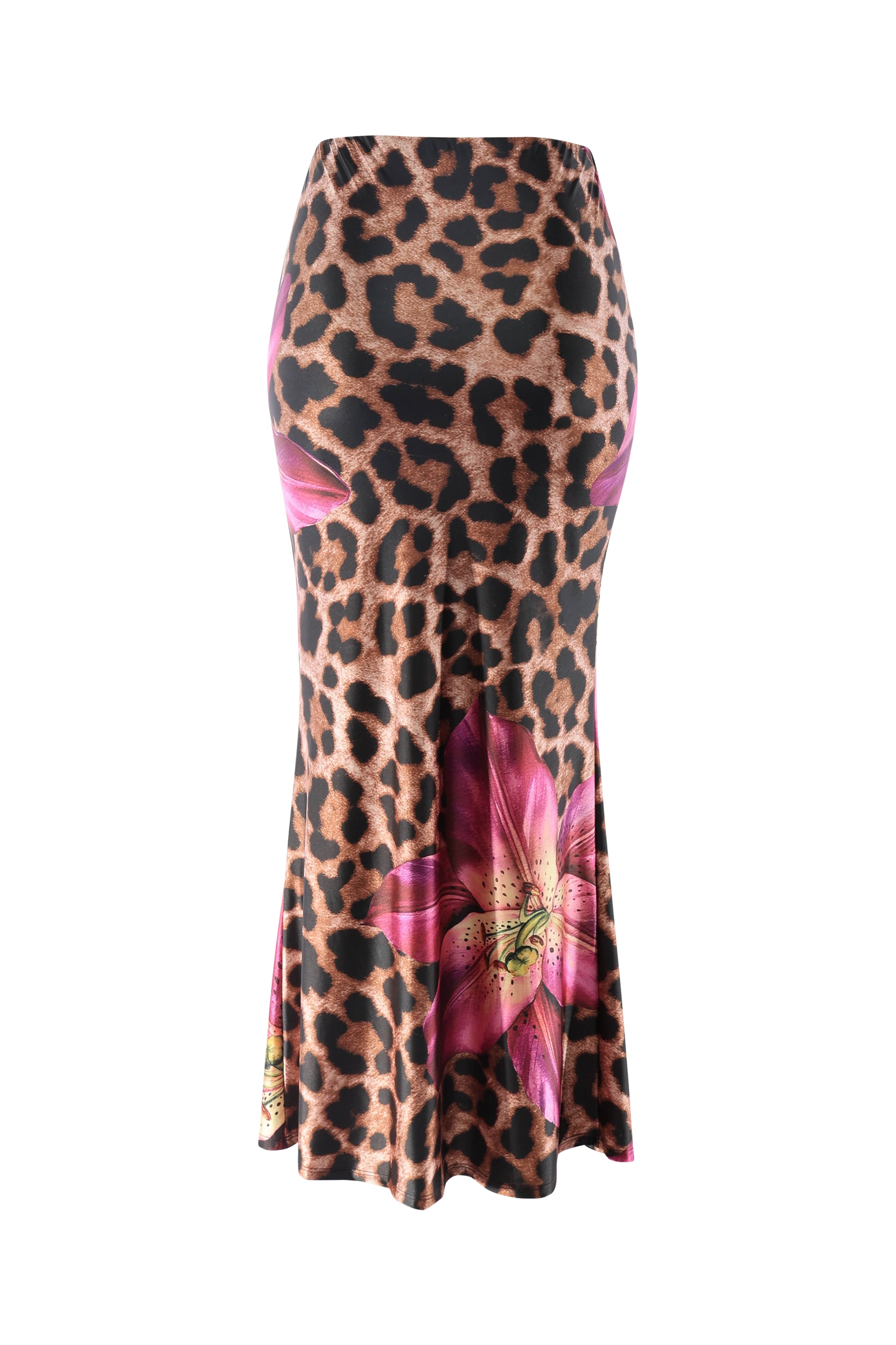Front view of high waisted floral leopard skirt with banded waistband and body-skimming fit