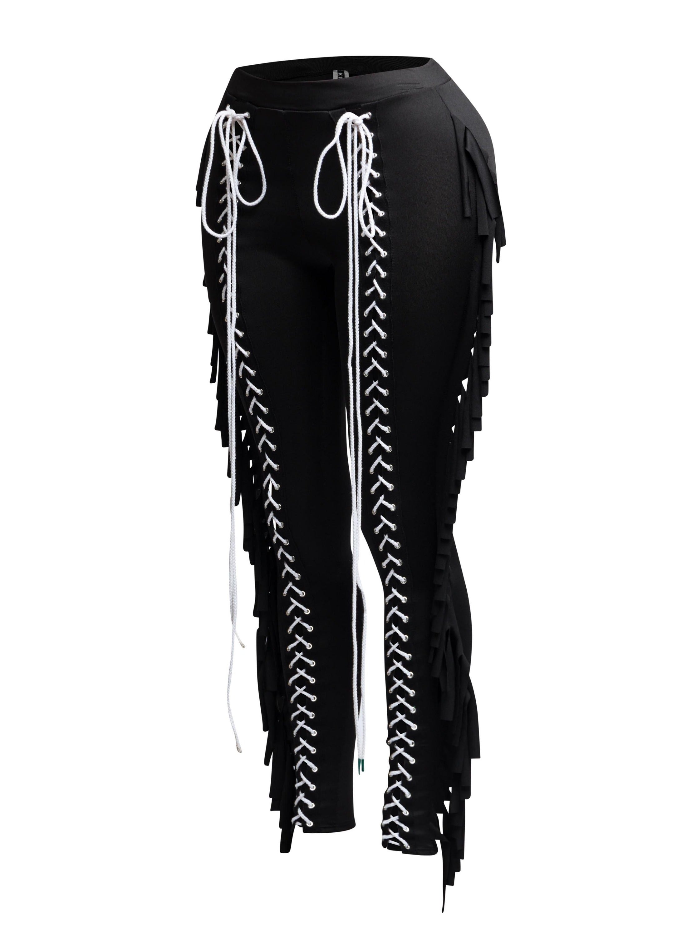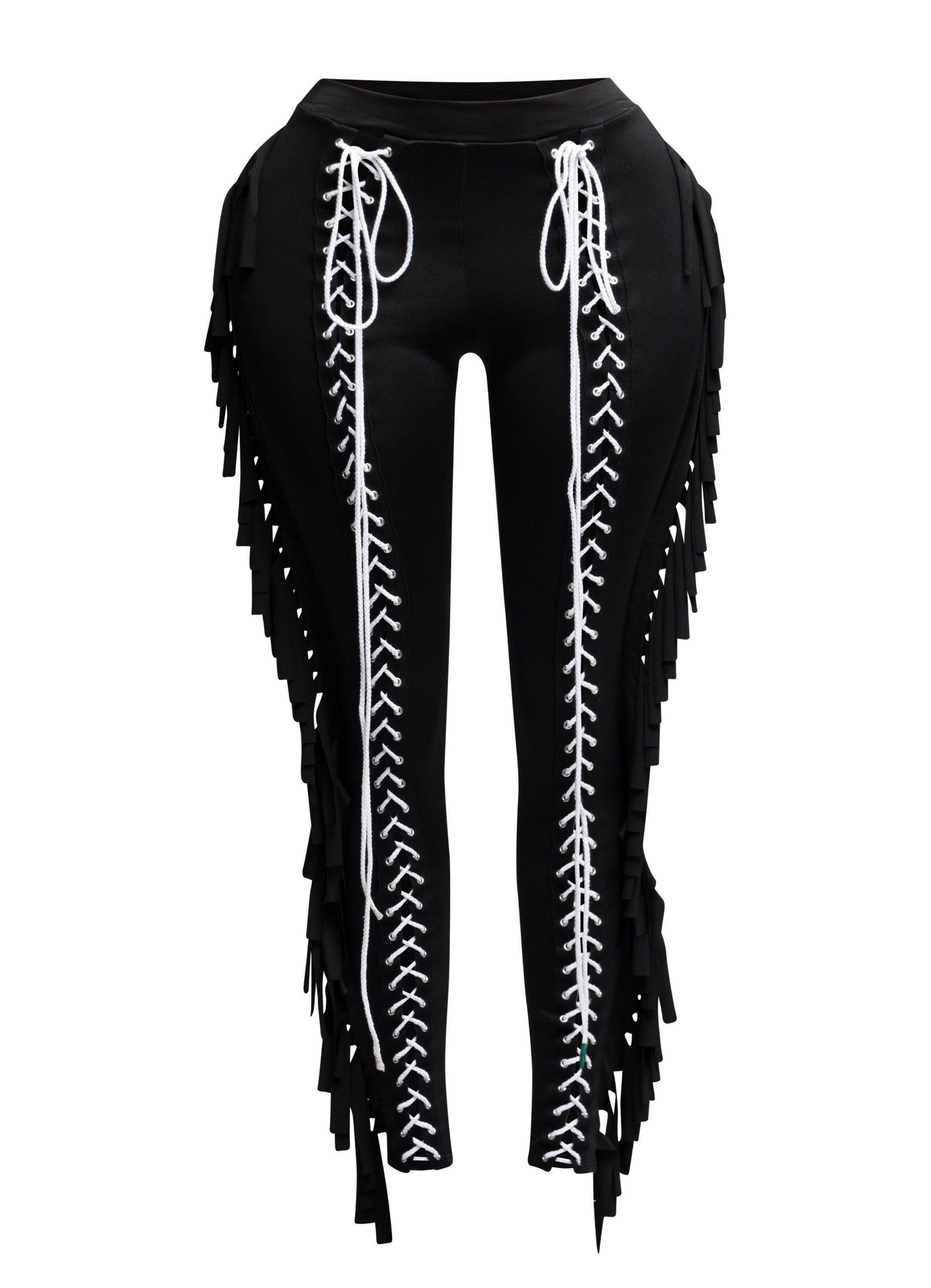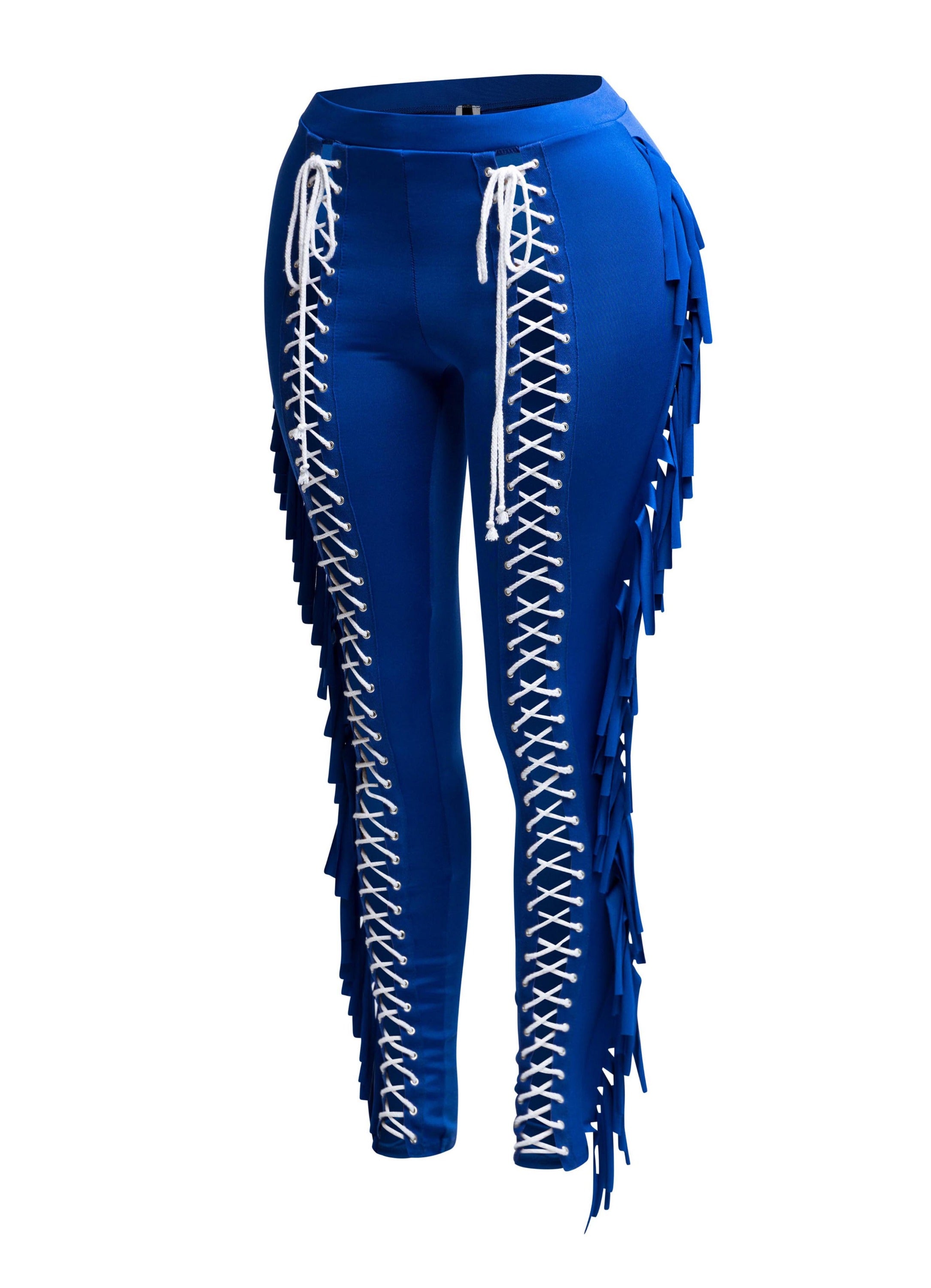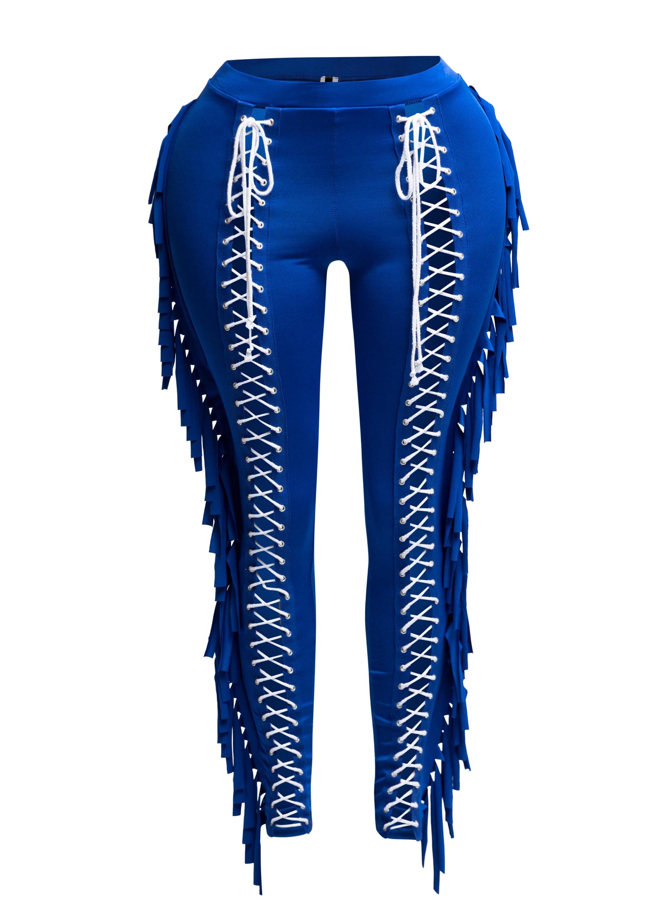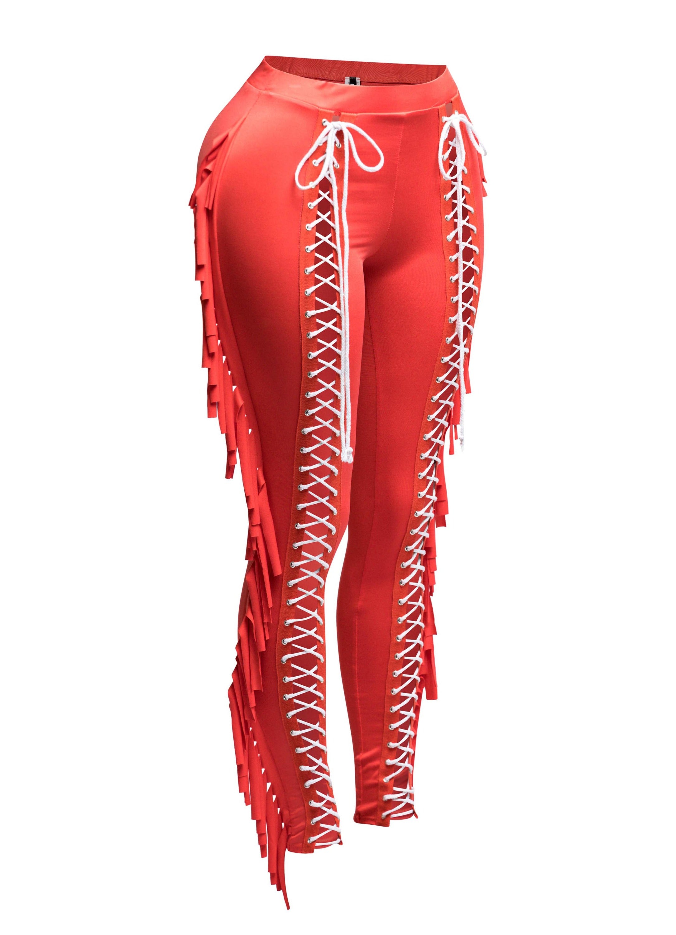Saddle up, style queen—these pants were made for bold entrances. The Fringe Play Lace-Up Skinny Pants serve up full main character energy with a body-hugging fit, lace-up front, and dramatic fringe cascading down the legs. Equal parts western-core and streetwear baddie, these are the ultimate statement piece for concerts, nightlife, or content-worthy outfits. Available in fiery red, bold cobalt blue, and classic black for every kind of vibe. Pair with a sleek bodysuit or crop top and let the fringe do the flirting.