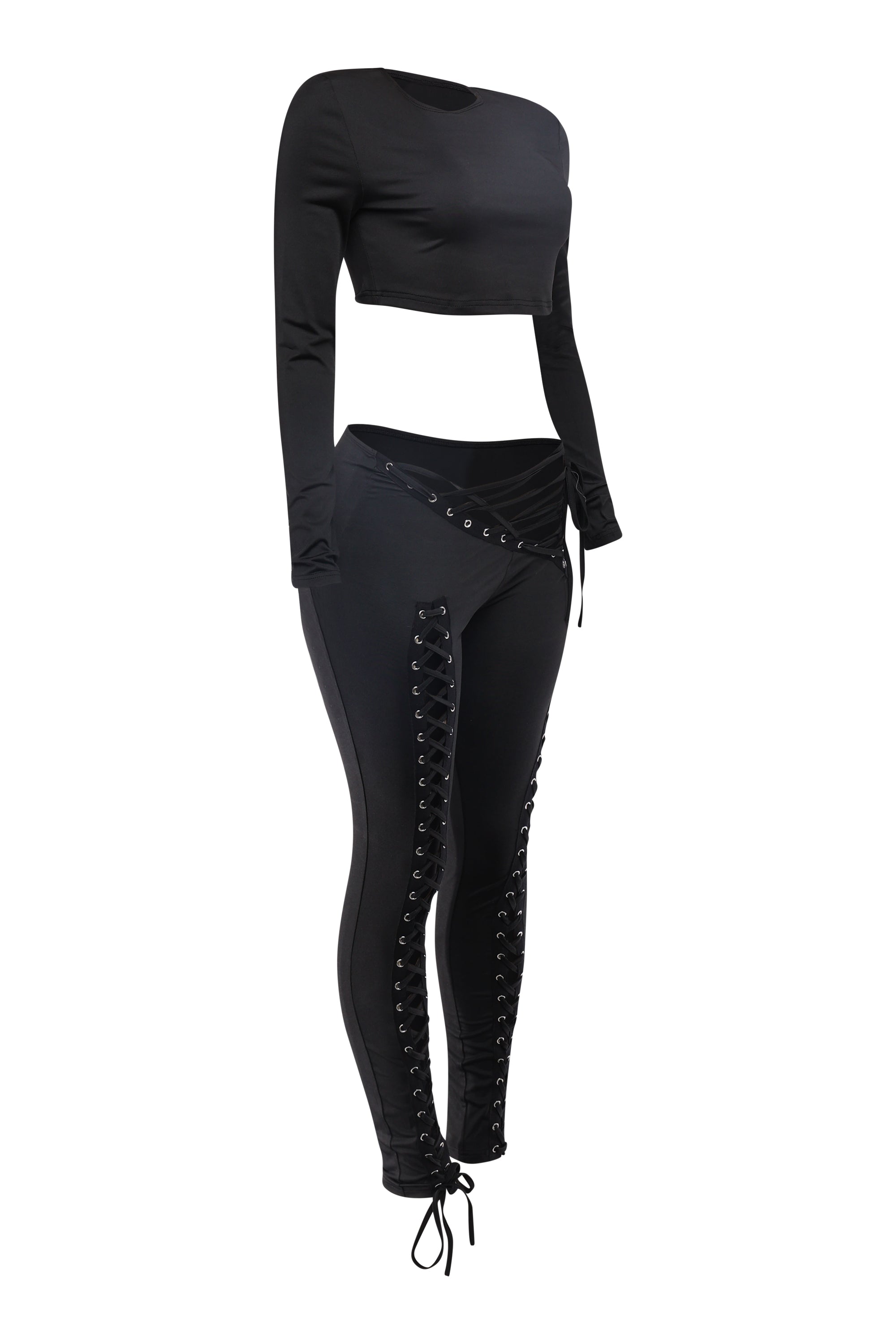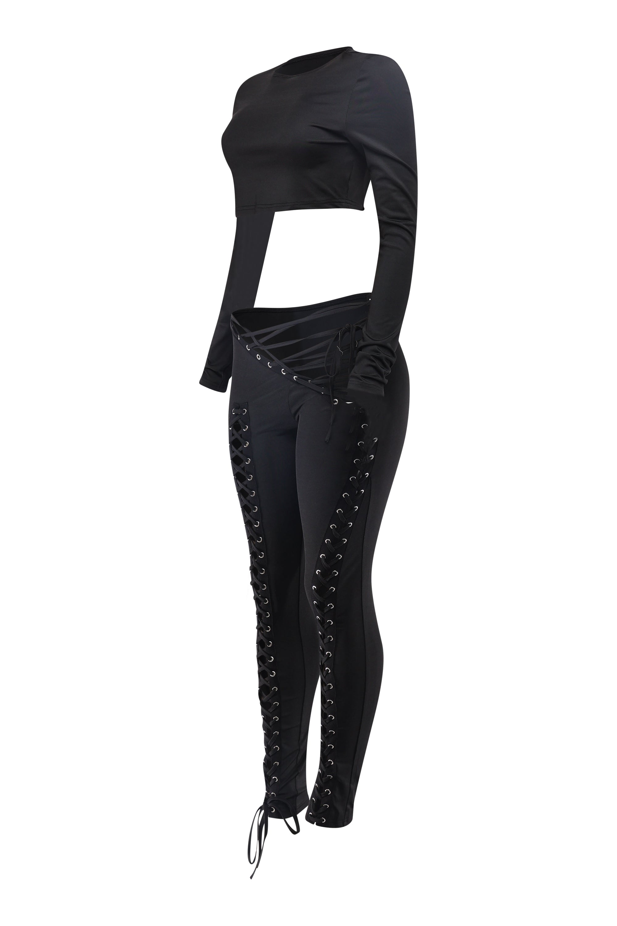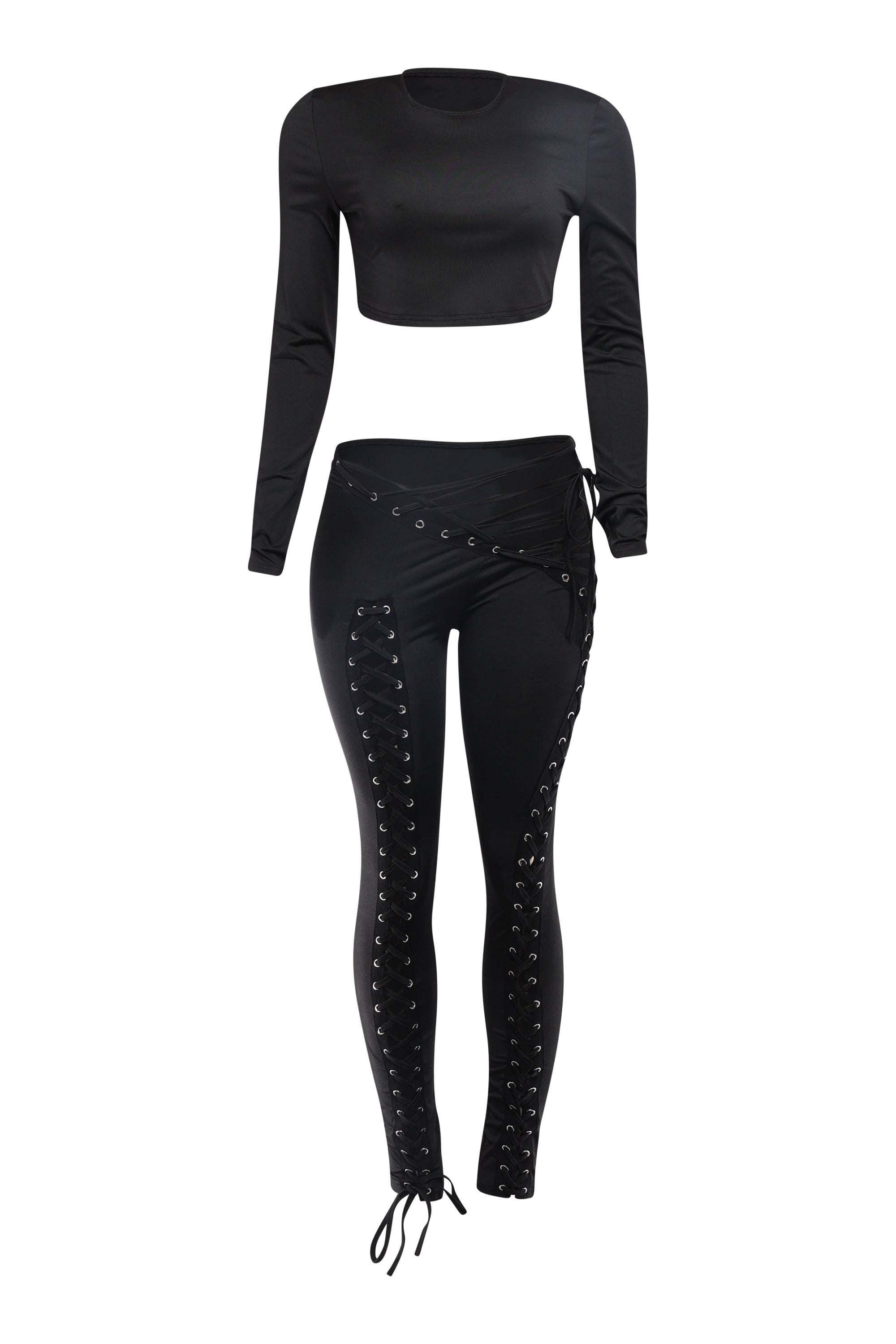 Make a bold statement with the Lace Up Detailed Pants & Top Set. This stylish two-piece features a roundneck, long sleeve crop top paired with slim-fit, ankle-length pants. Designed with lace-up detailing for an edgy twist, this set blends chic sophistication with a daring vibe. Made with stretch fabric for comfort, it’s perfect for night outs, parties, or making an everyday look stand out.