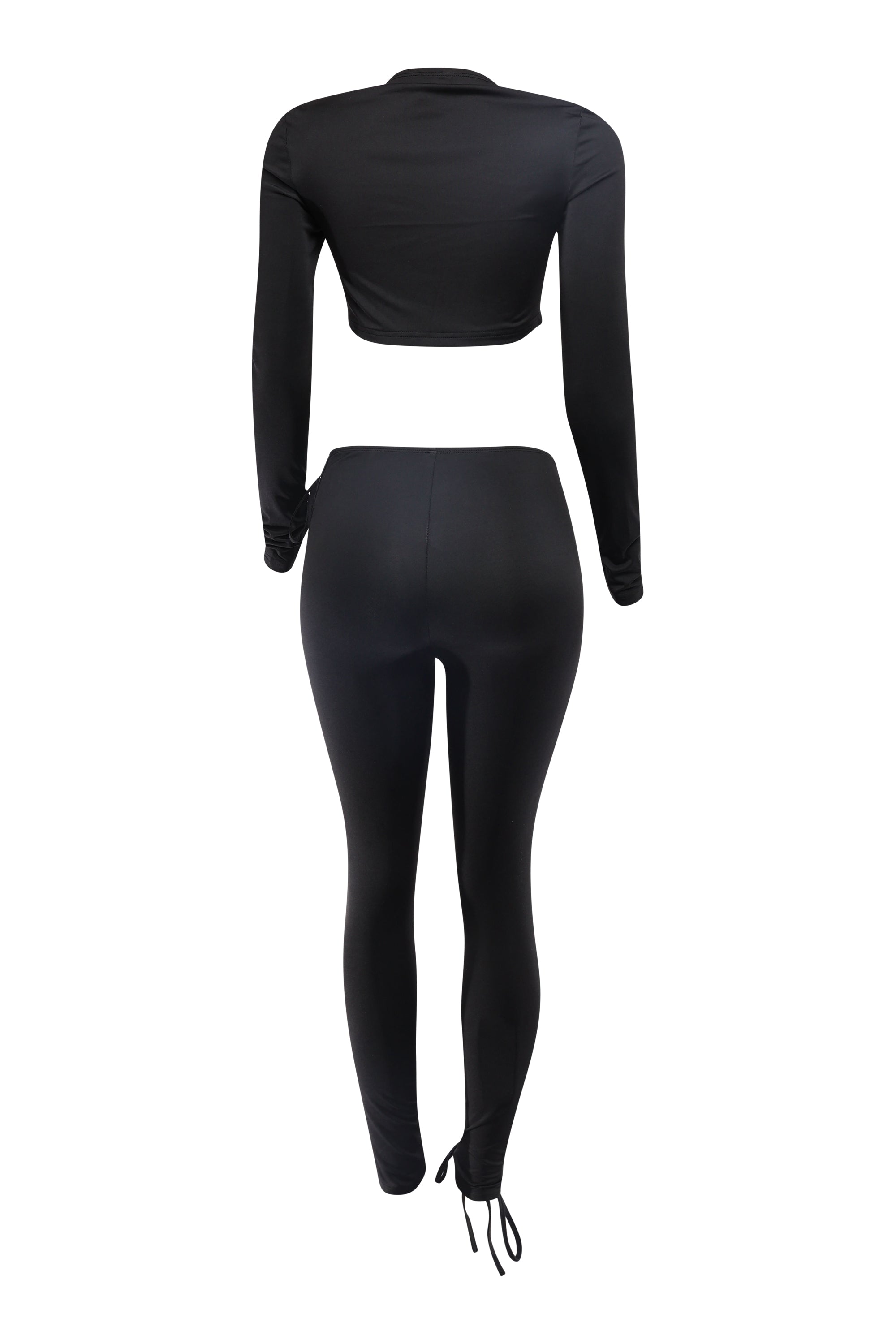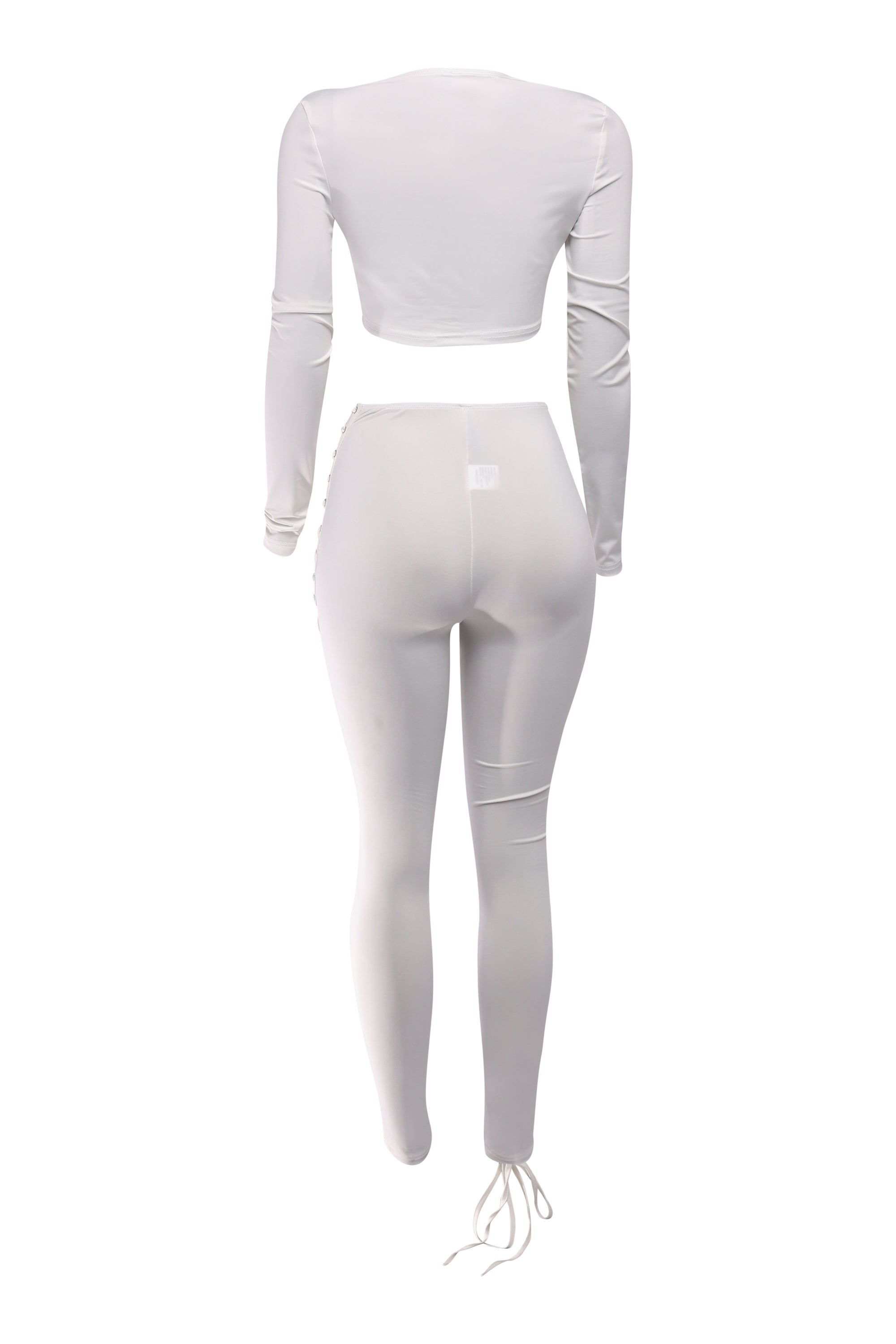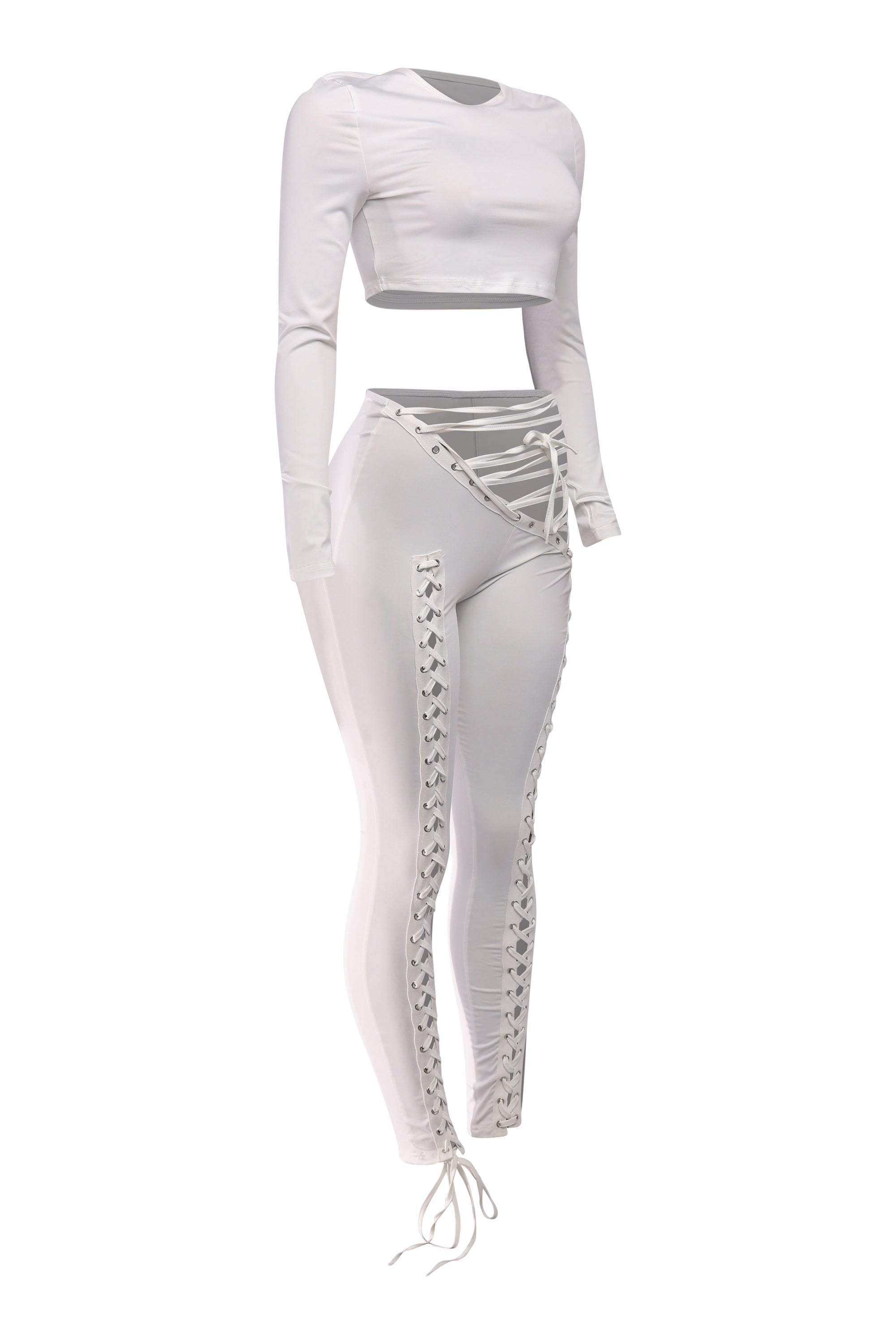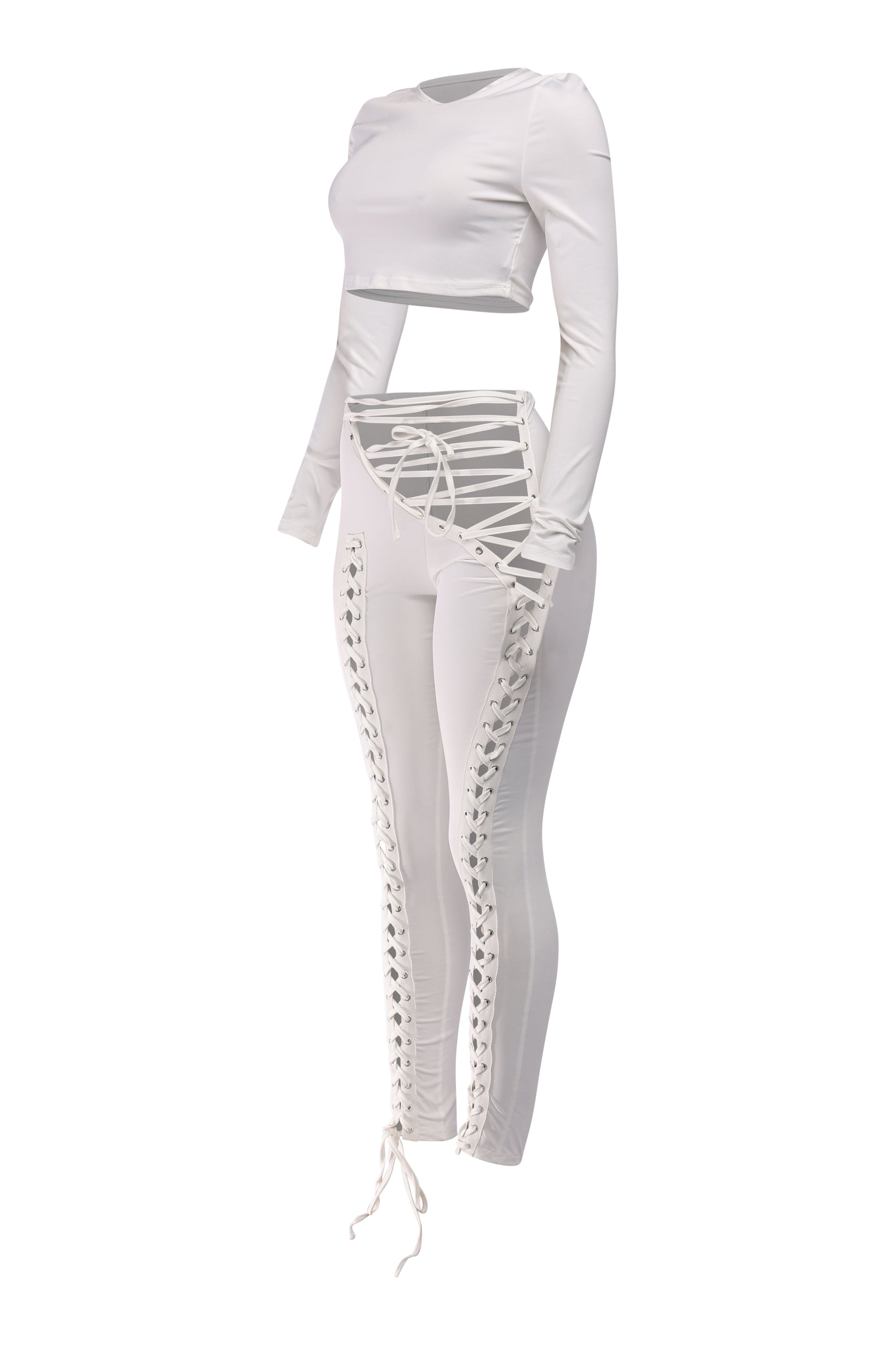Make a bold statement with the Lace Up Detailed Pants & Top Set. This stylish two-piece features a roundneck, long sleeve crop top paired with slim-fit, ankle-length pants. Designed with lace-up detailing for an edgy twist, this set blends chic sophistication with a daring vibe. Made with stretch fabric for comfort, it’s perfect for night outs, parties, or making an everyday look stand out.