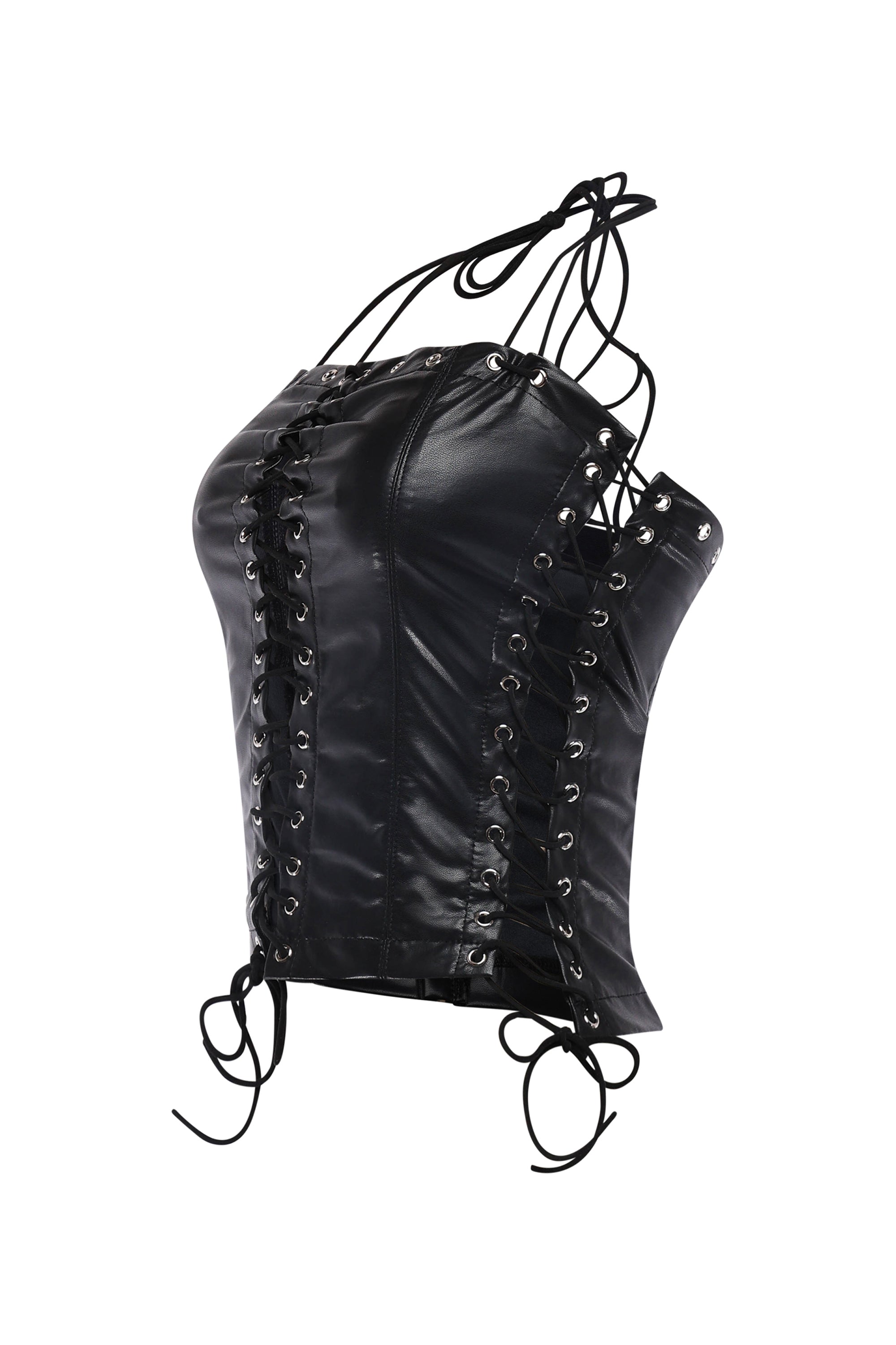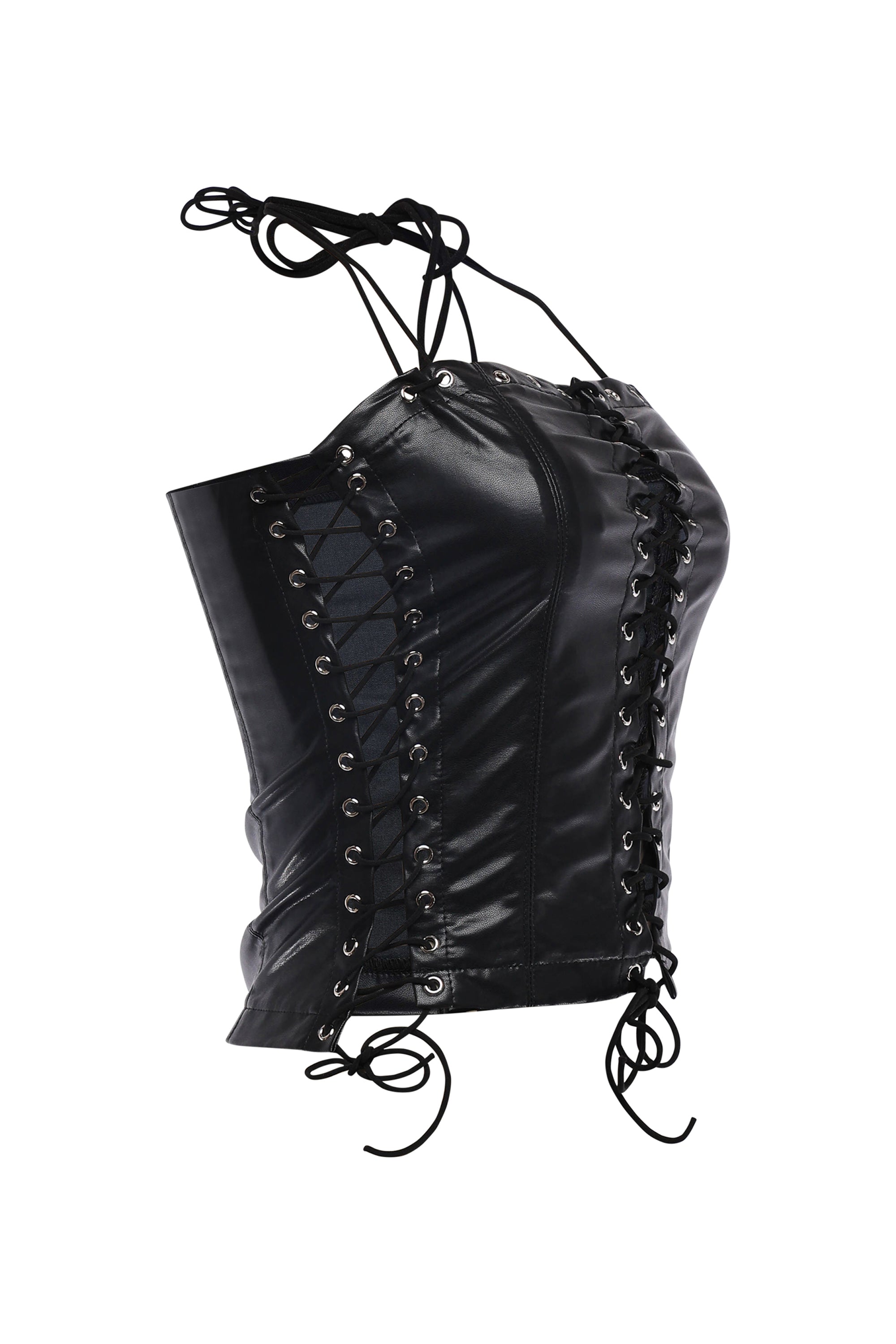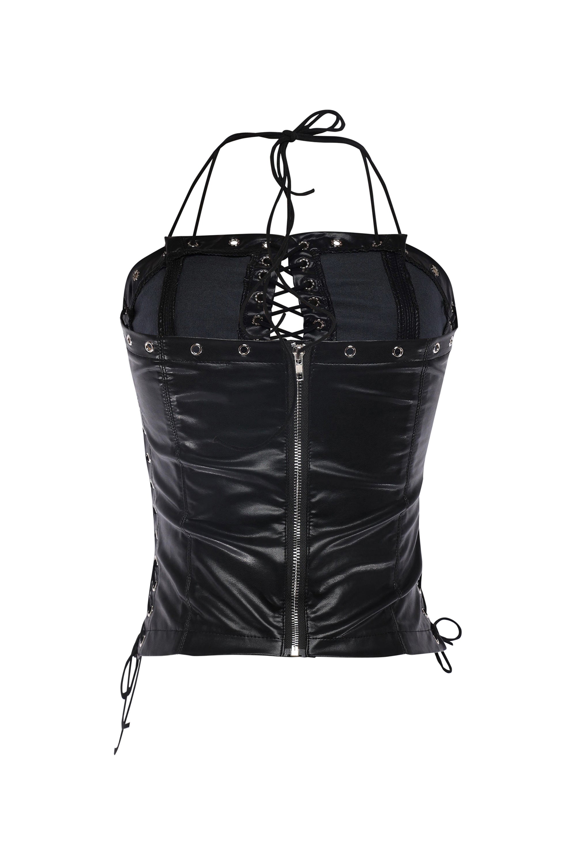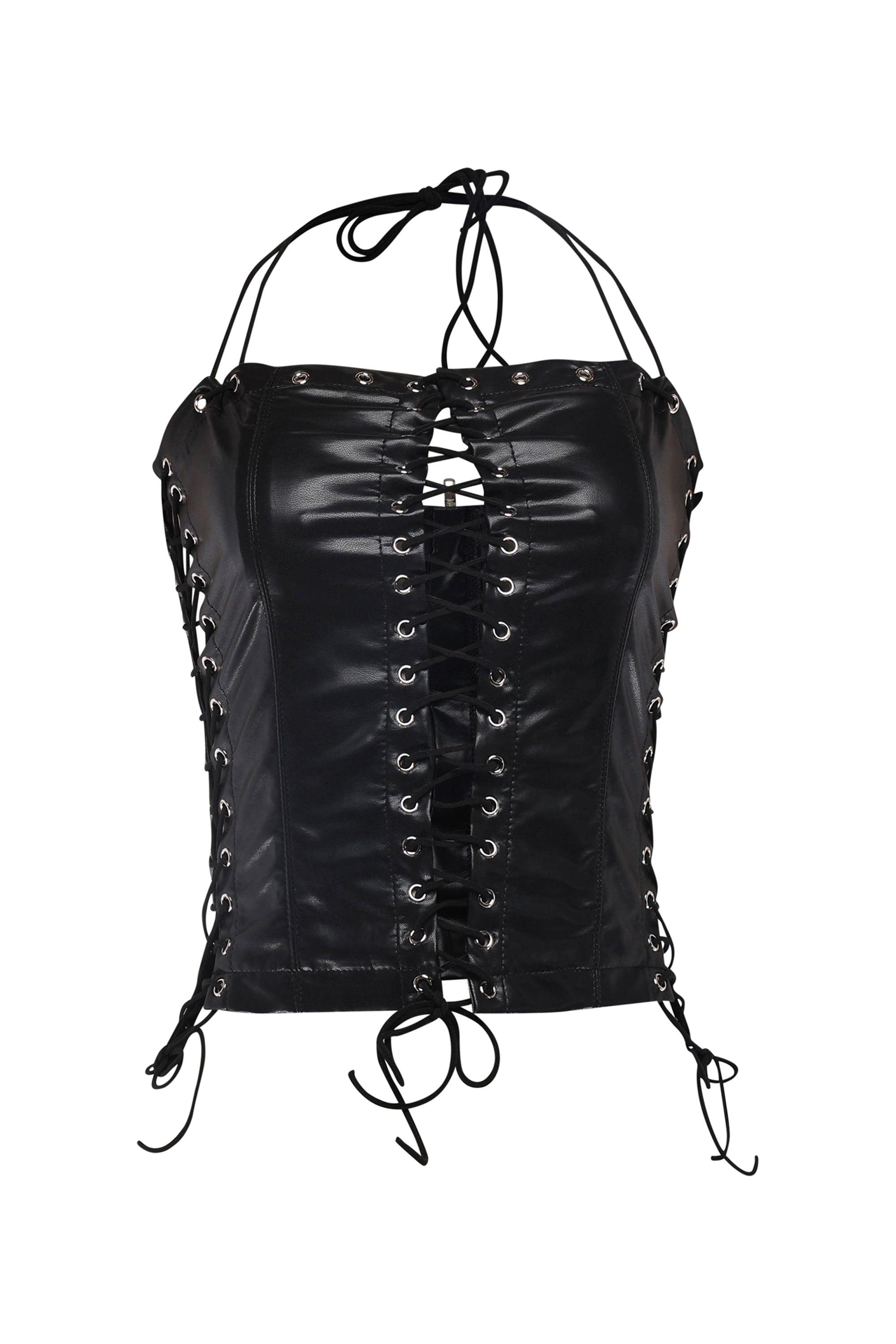 No one’s playing it safe in the Bad Behavior Lace-Up Vinyl Corset Top. This high-gloss, lace-up halter delivers straight attitude with a curve-hugging fit and daring details from front to back. Featuring a plunging lace-up front, side lace accents, and a sleek back zipper for easy on-off, it’s made for turning heads—whether you're headed to the club, styling for a concert, or throwing down a bold look on IG. The vinyl finish and bodycon stretch add extra drama, while the halter neckline lifts and shapes for major it-girl energy.