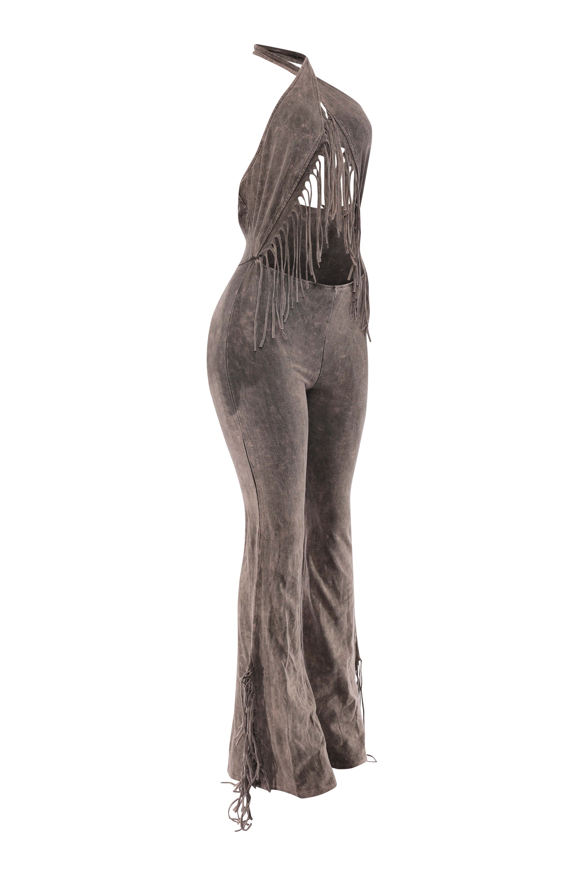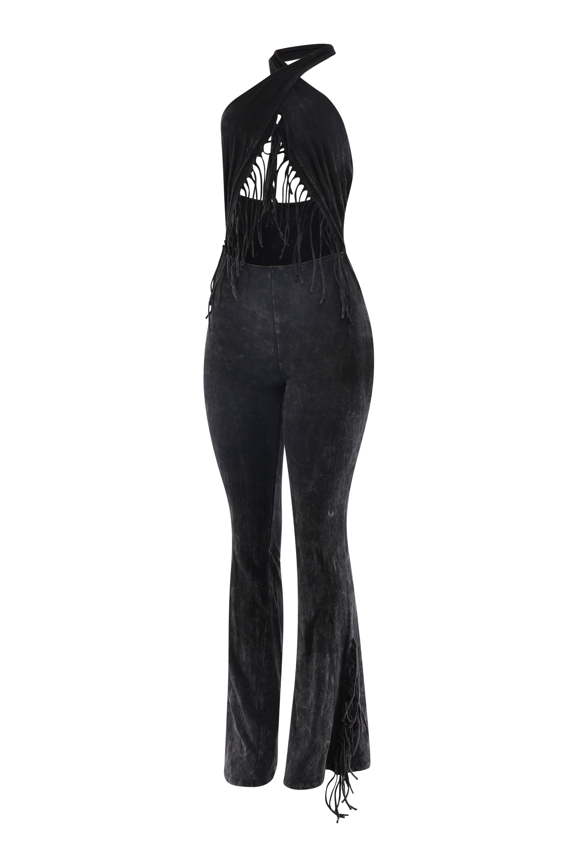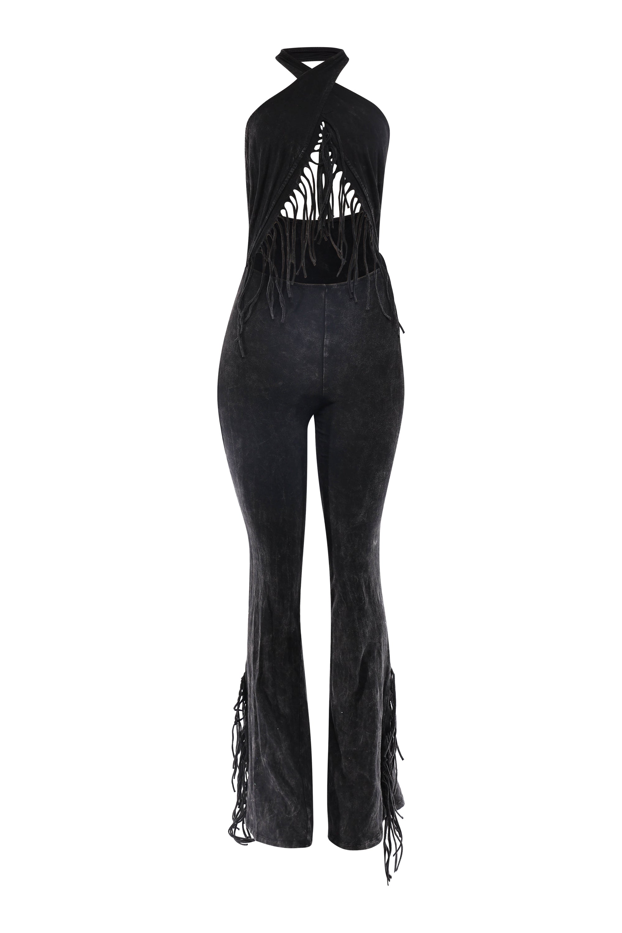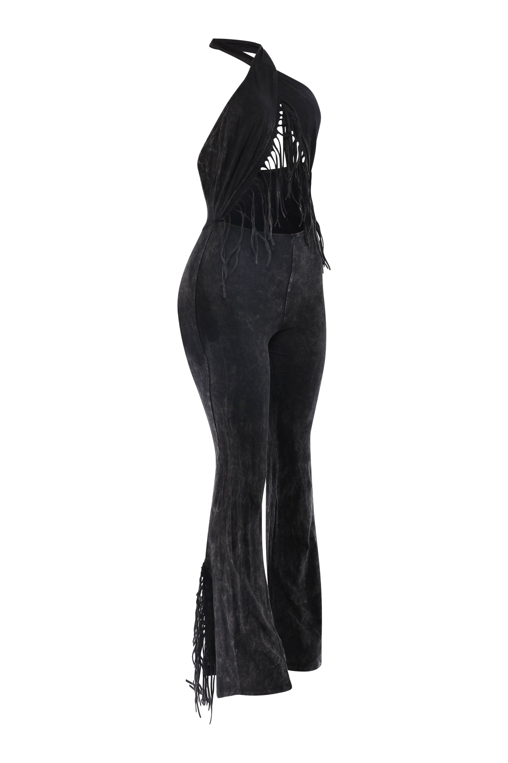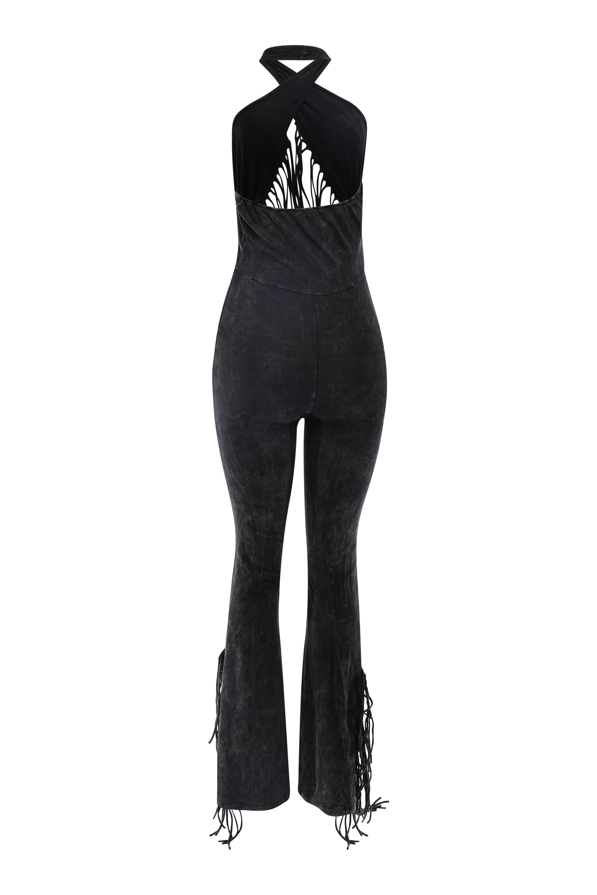 Turn heads in the Mineral Washed Halter Fringe Jumpsuit, designed with a bold halter neckline and playful fringe details. Crafted from soft stretch cotton, this slim-fit jumpsuit hugs your curves while offering comfort and style. The open back and mineral wash finish add a unique, one-of-a-kind look to your outfit. Perfect for festivals, parties, or a night out.