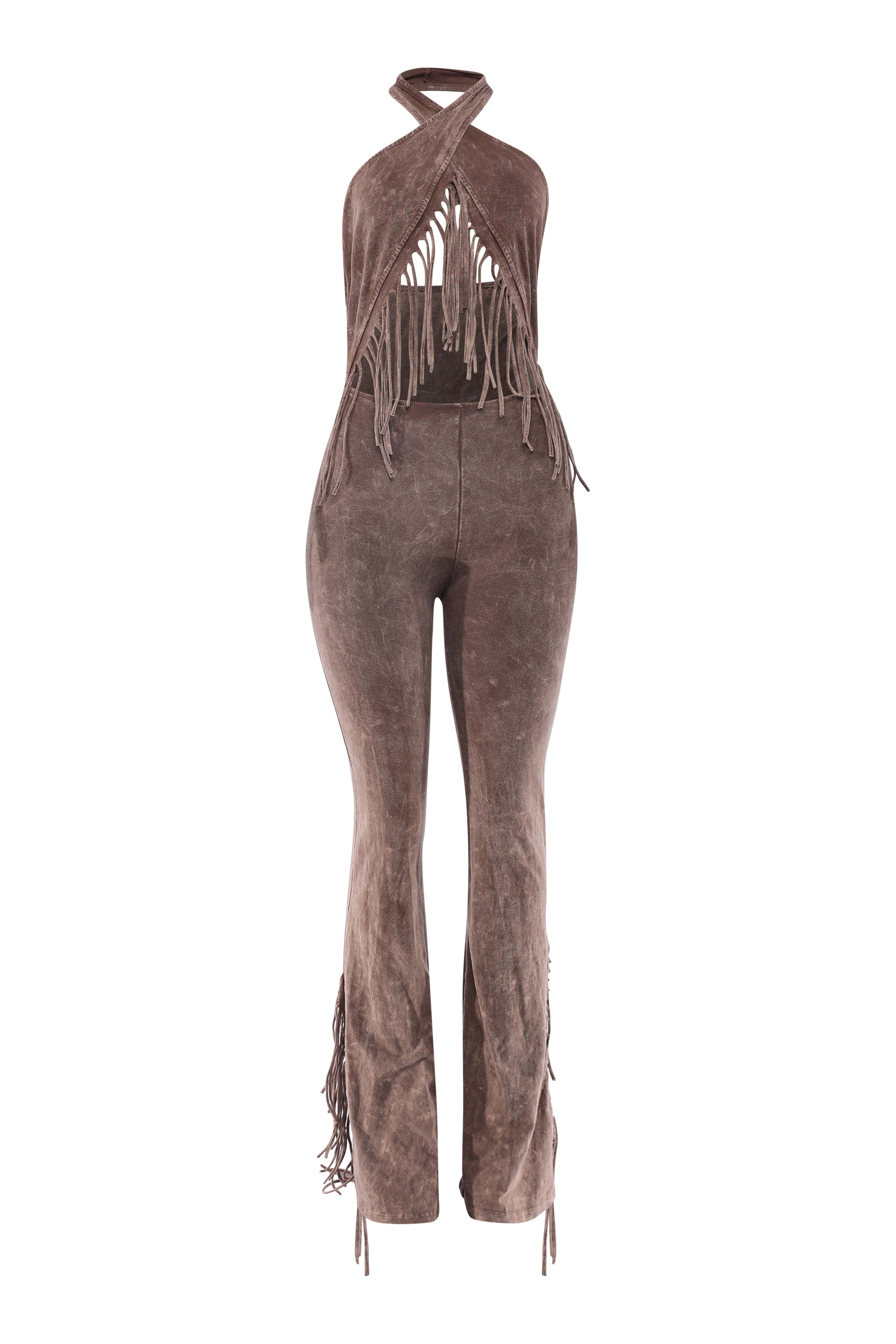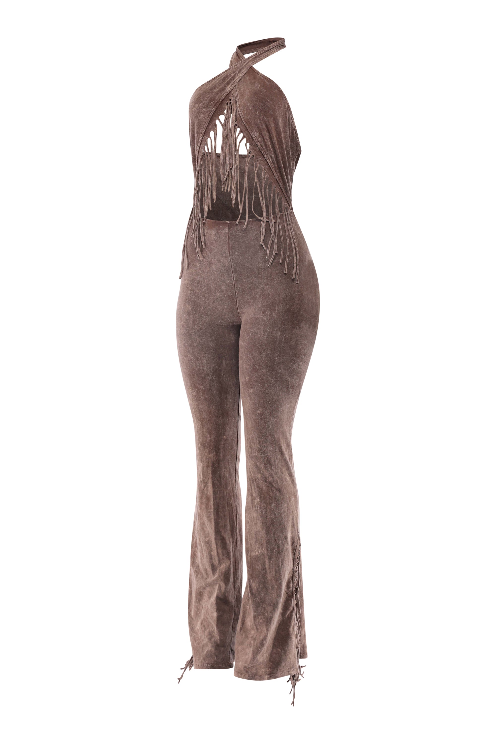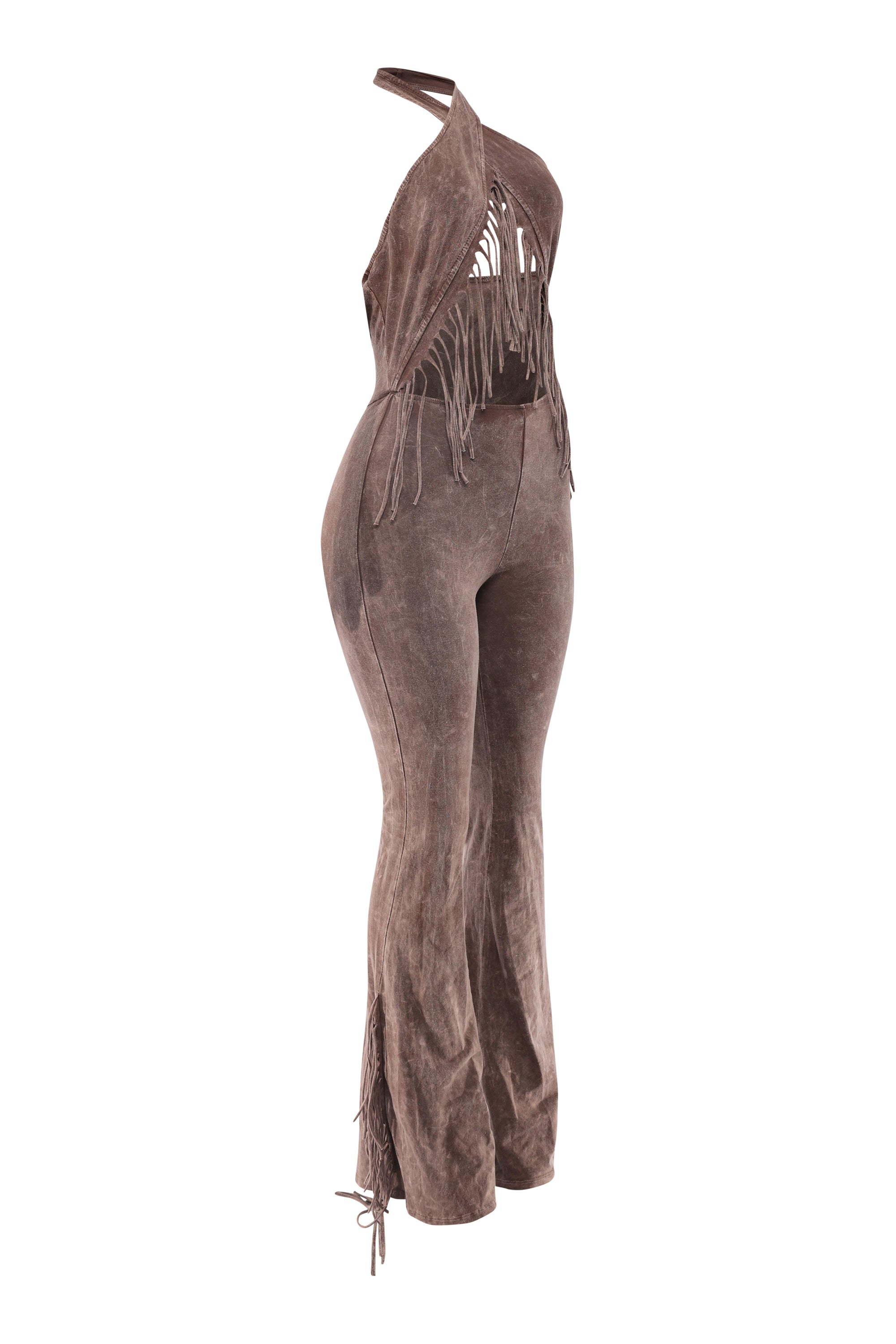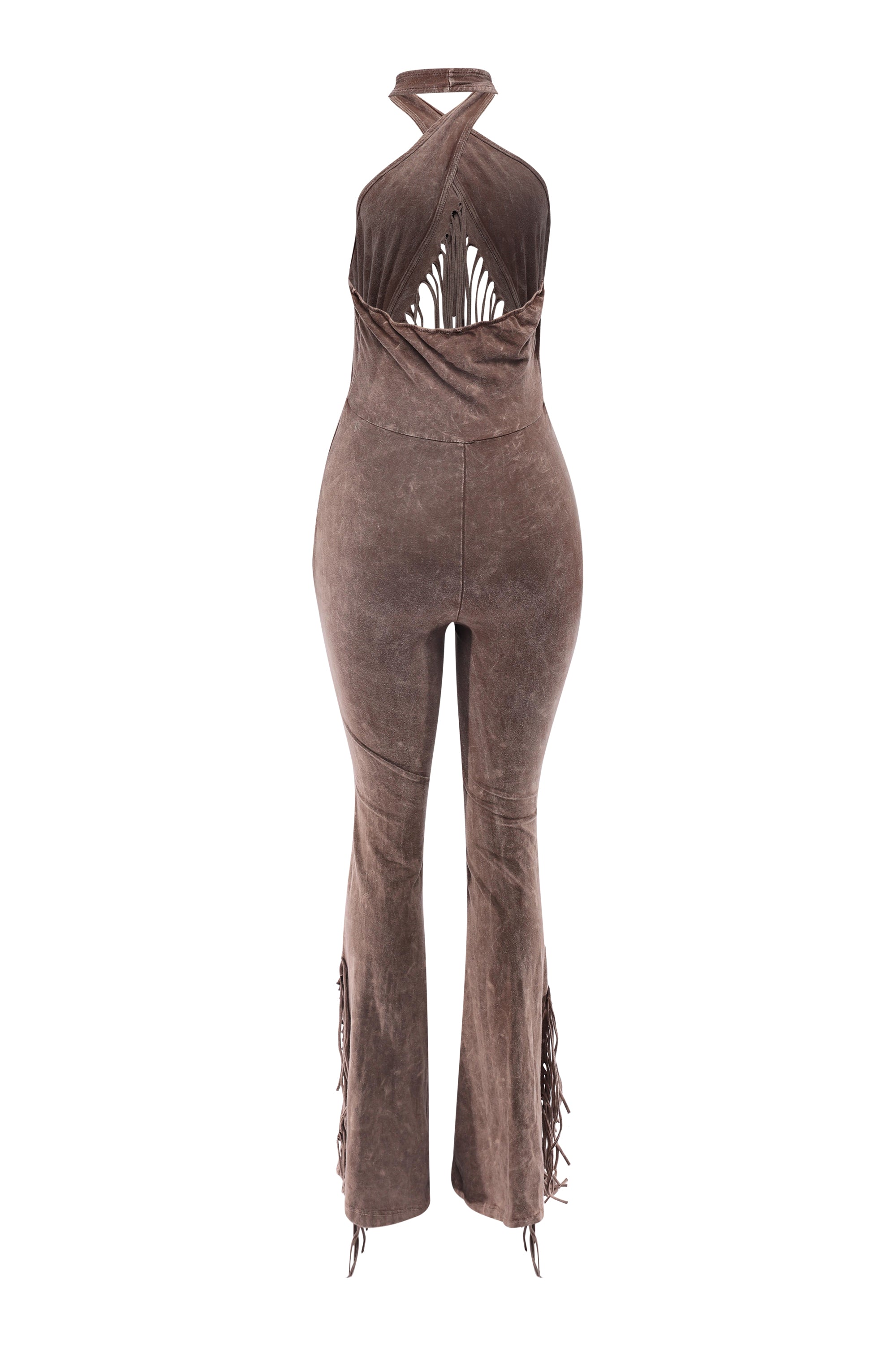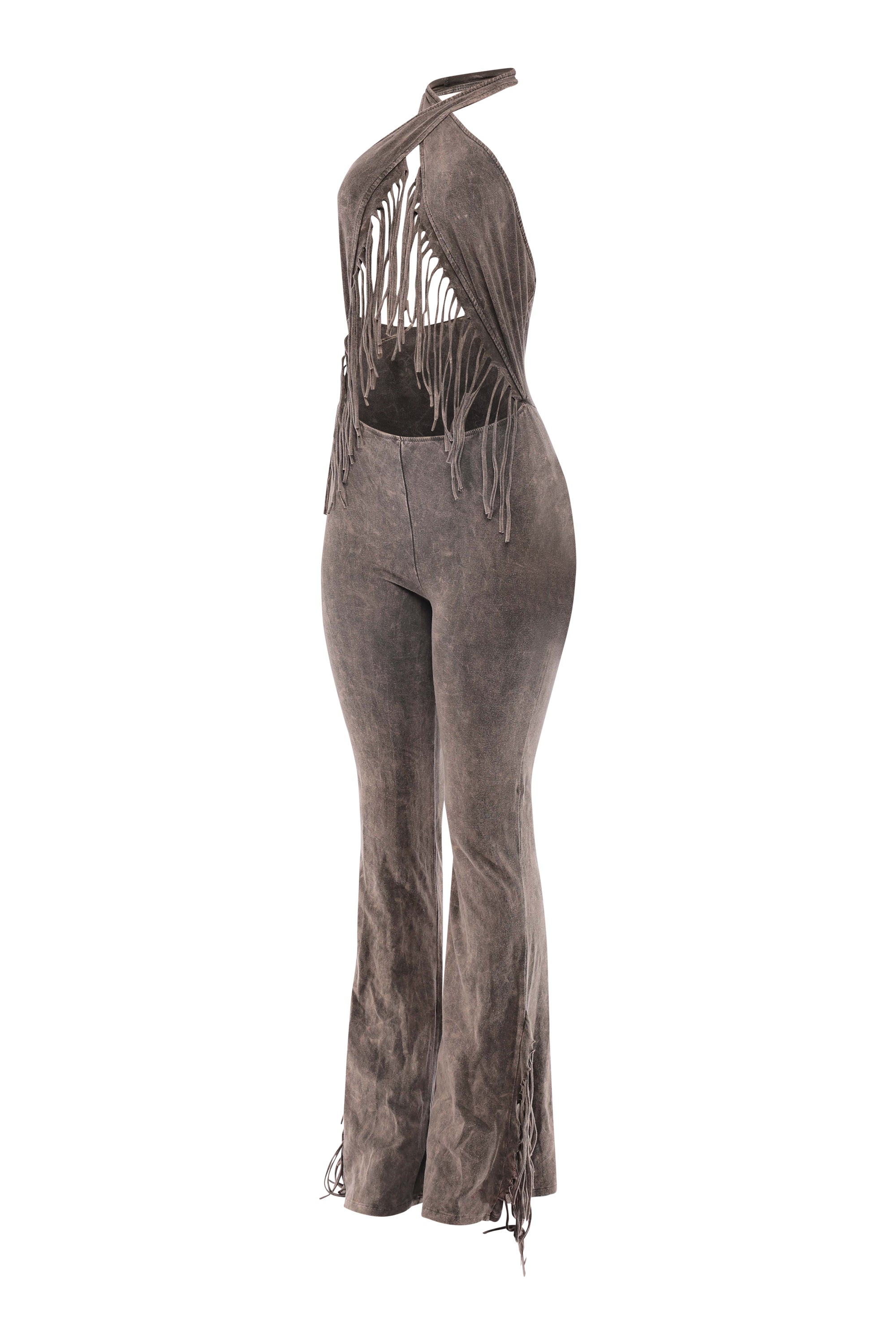 Turn heads in the Mineral Washed Halter Fringe Jumpsuit, designed with a bold halter neckline and playful fringe details. Crafted from soft stretch cotton, this slim-fit jumpsuit hugs your curves while offering comfort and style. The open back and mineral wash finish add a unique, one-of-a-kind look to your outfit. Perfect for festivals, parties, or a night out.