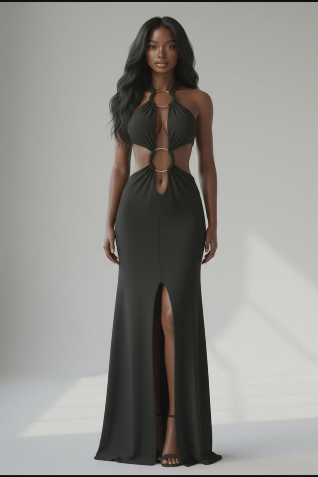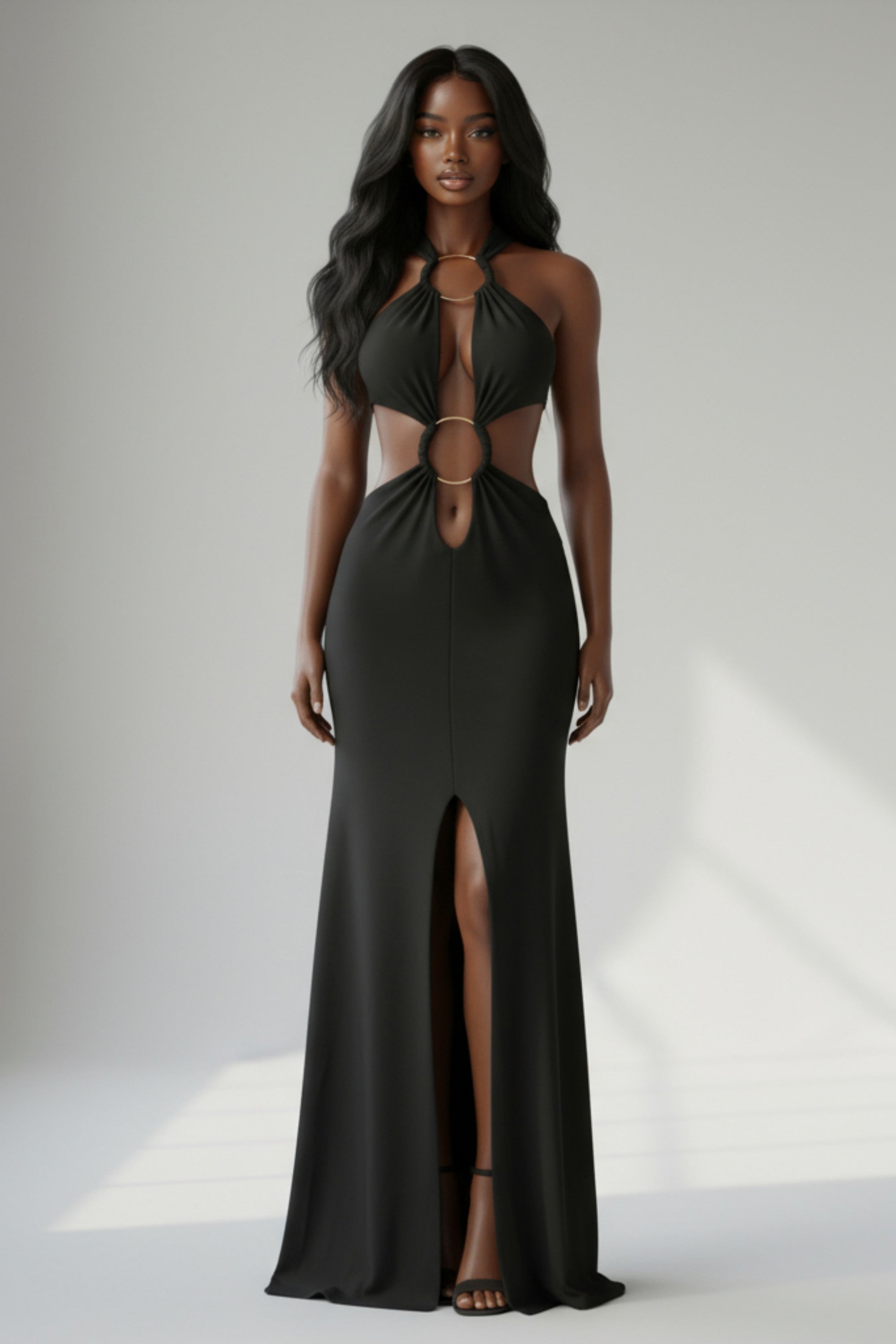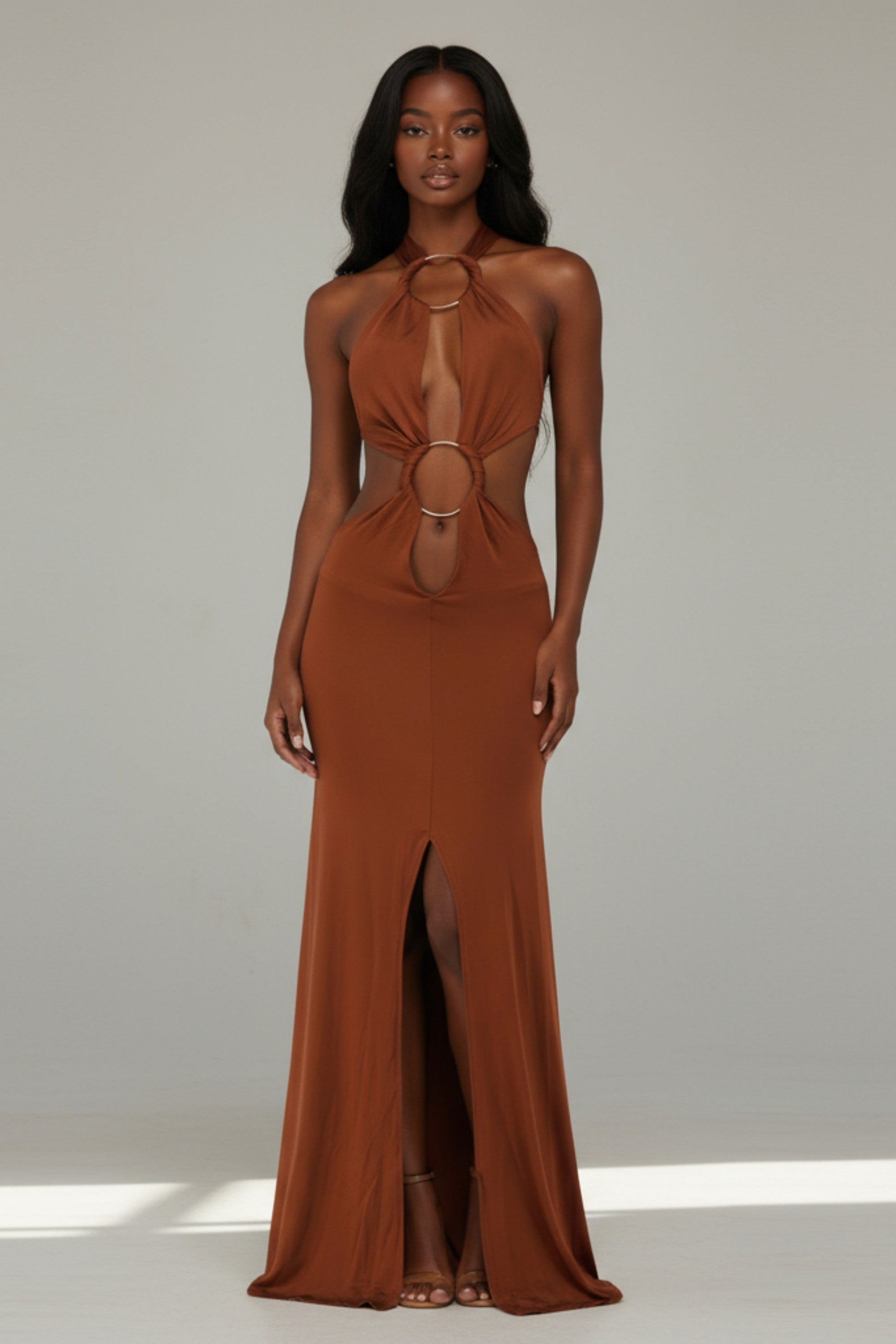 • Halter neck maxi dress with dramatic front circle cutouts