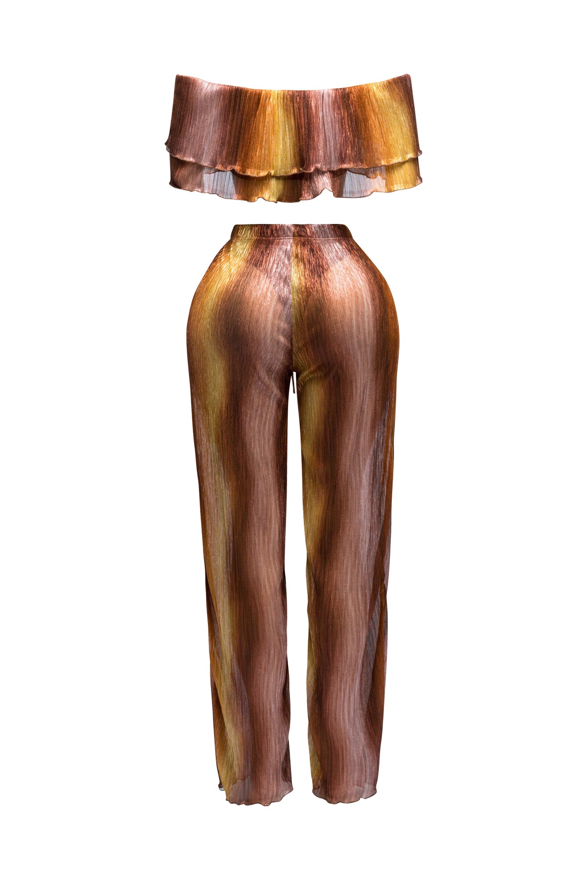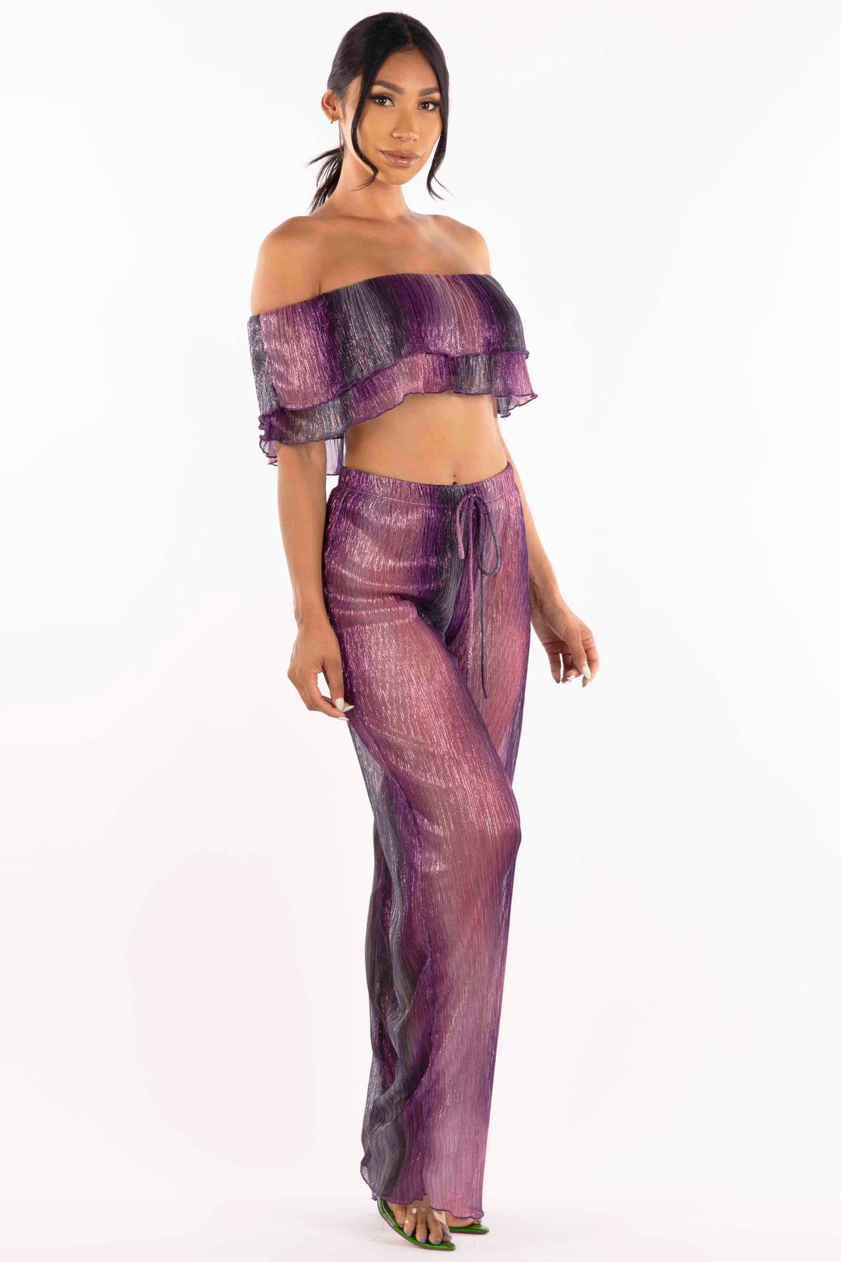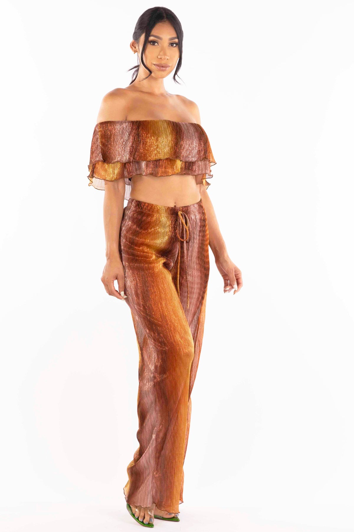 Turn heads with our Ruffle Off-Shoulder Set. The playful ruffle detailing adds a touch of romance to the off-shoulder top, while the coordinating bottoms complete the chic ensemble. Perfect for a stylish and feminine look. Elevate your wardrobe with this trendy matching set