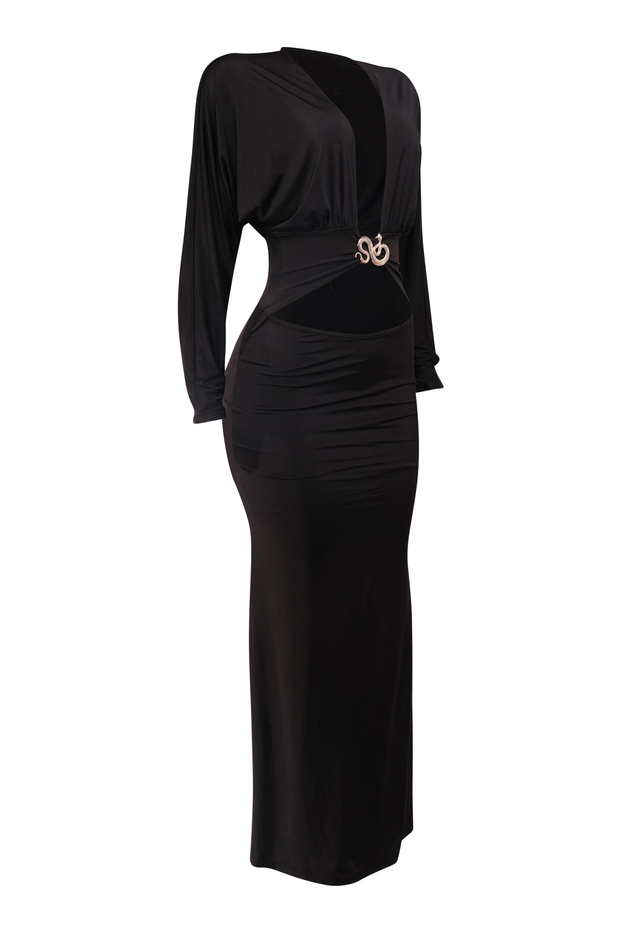 Own every entrance in the Snake Charmer Plunge Cutout Maxi Dress—a dangerously sexy silhouette with bold energy and undeniable edge. This sleek, slim-fit stunner features a plunging V neckline, dramatic batwing sleeves, and a sculpted waist cutout trimmed with a gleaming snake-inspired front buckle. The flared hemline brings just the right touch of drama, while the stretch fabric hugs in all the right places. Perfect for a night out, date night, or red-hot party moment. Available in heat-bringing red, sultry black, and luxe mocha brown.