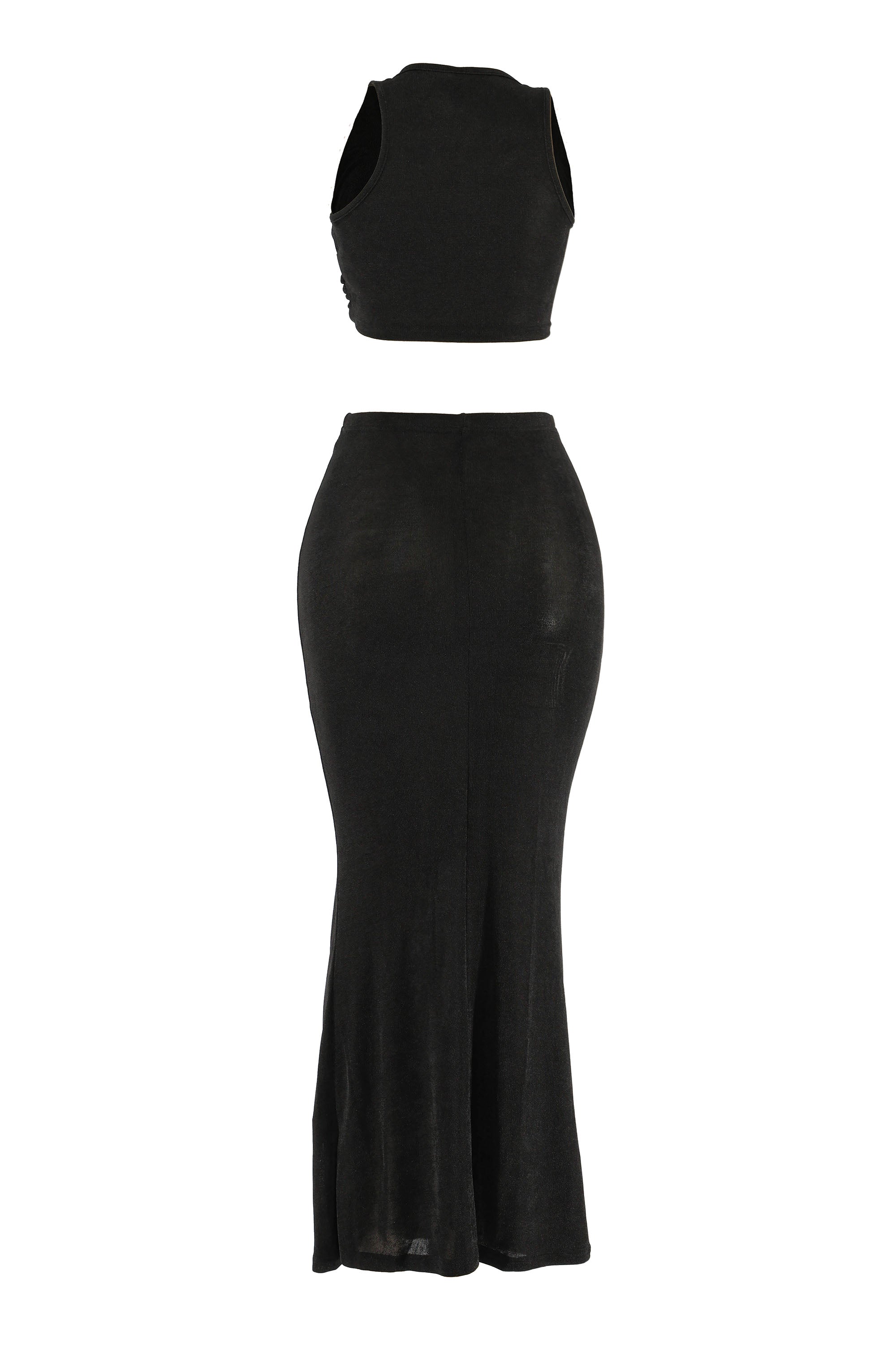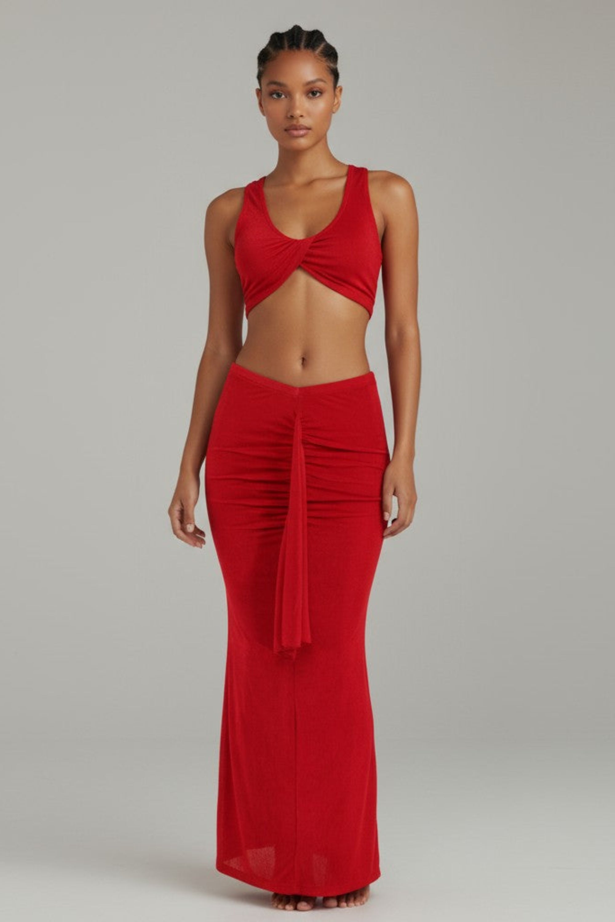 Serving sculpt and drama in one set. The Heatstroke Twist Set Maxi Duo delivers sultry goddess energy with a twisted front V-neck crop top and a coordinating ruched maxi skirt that clings in all the right places. The draped tie detail adds movement while the flared hem softens the silhouette for that slow-motion walk moment. Designed in soft stretch fabric with a pull-on fit and elastic waistband, this two-piece is your new obsession for rooftop parties, vacay nights, or turning casual plans into full-blown slay. Available in three bold colorways so you can match the mood.